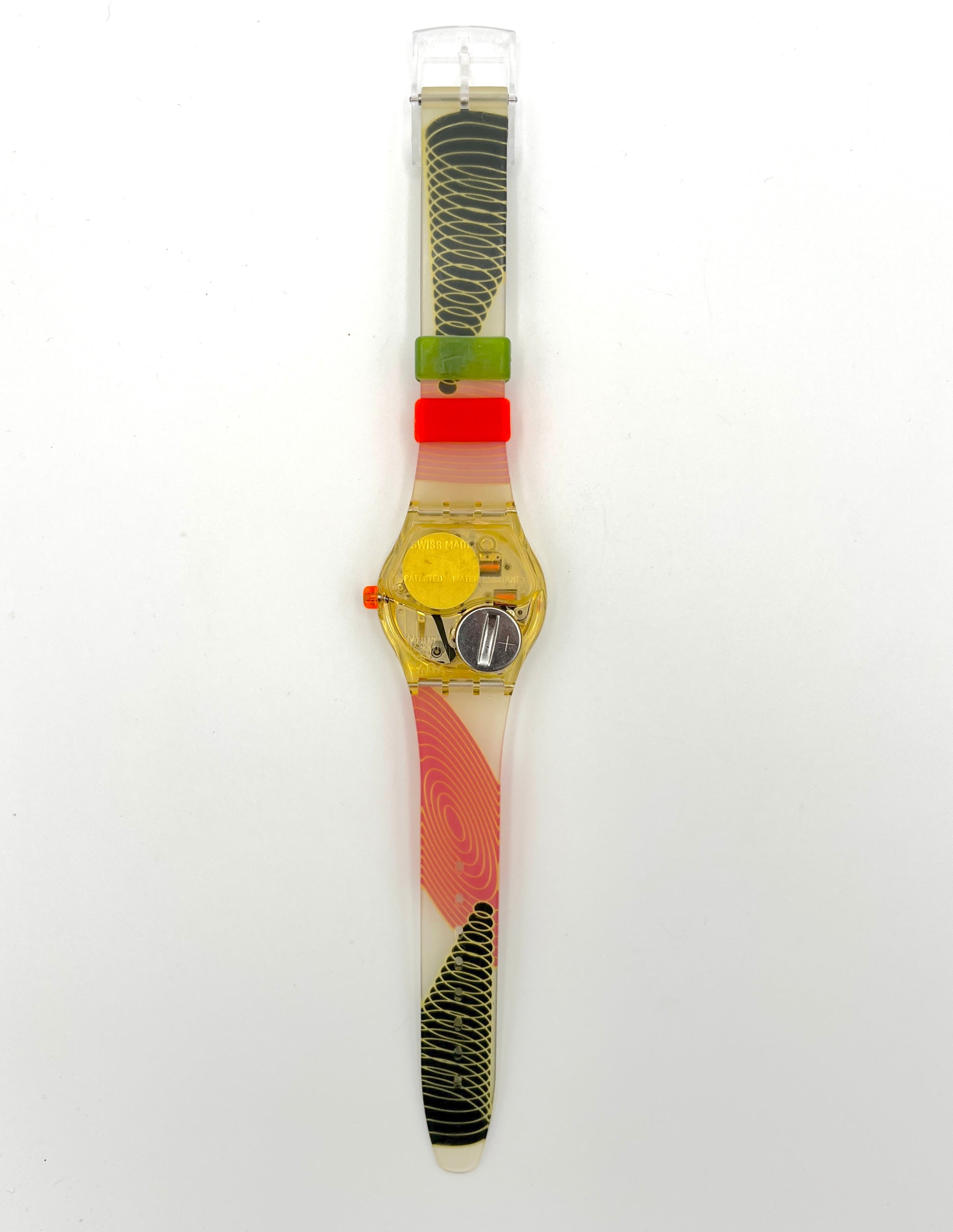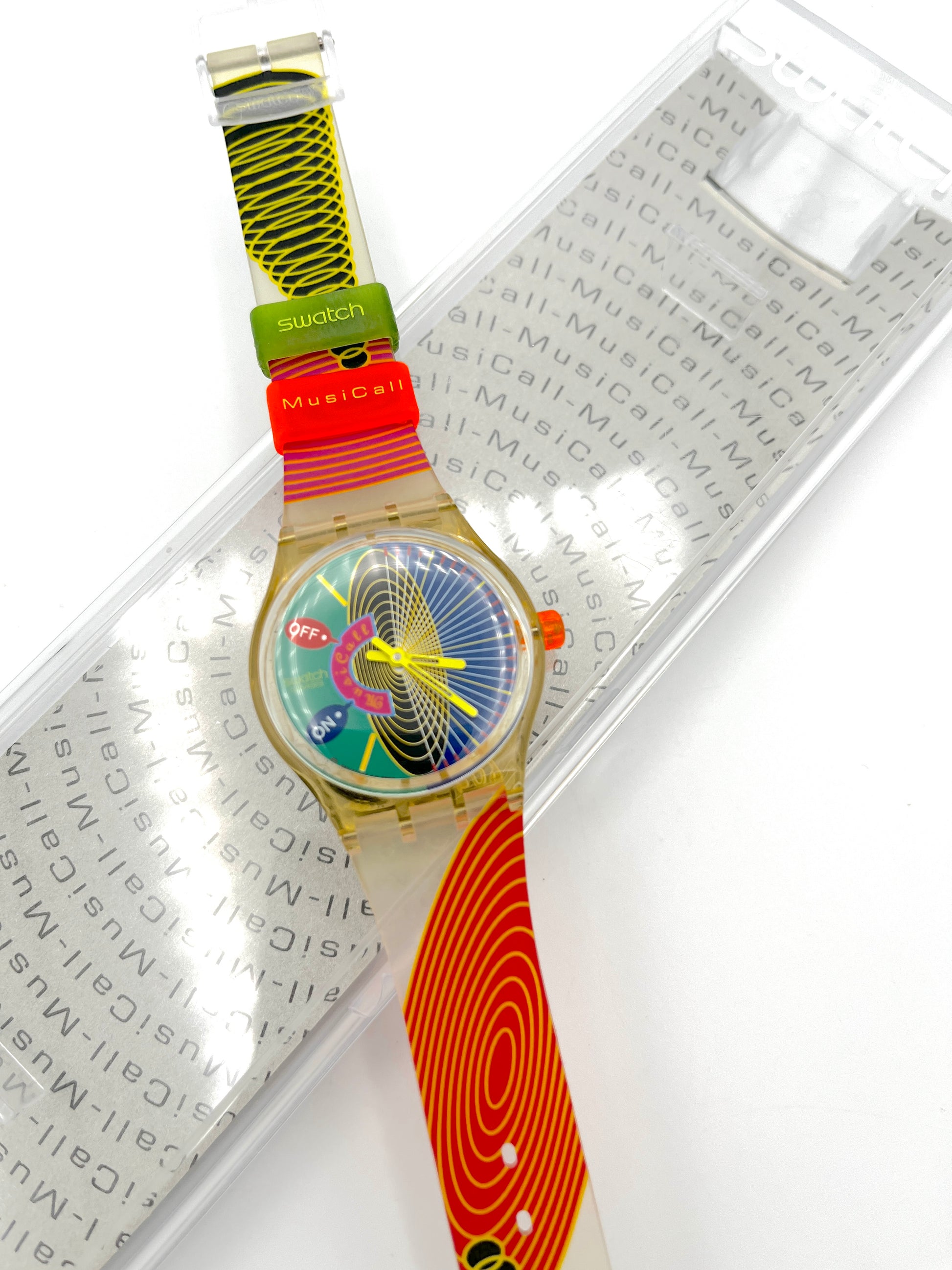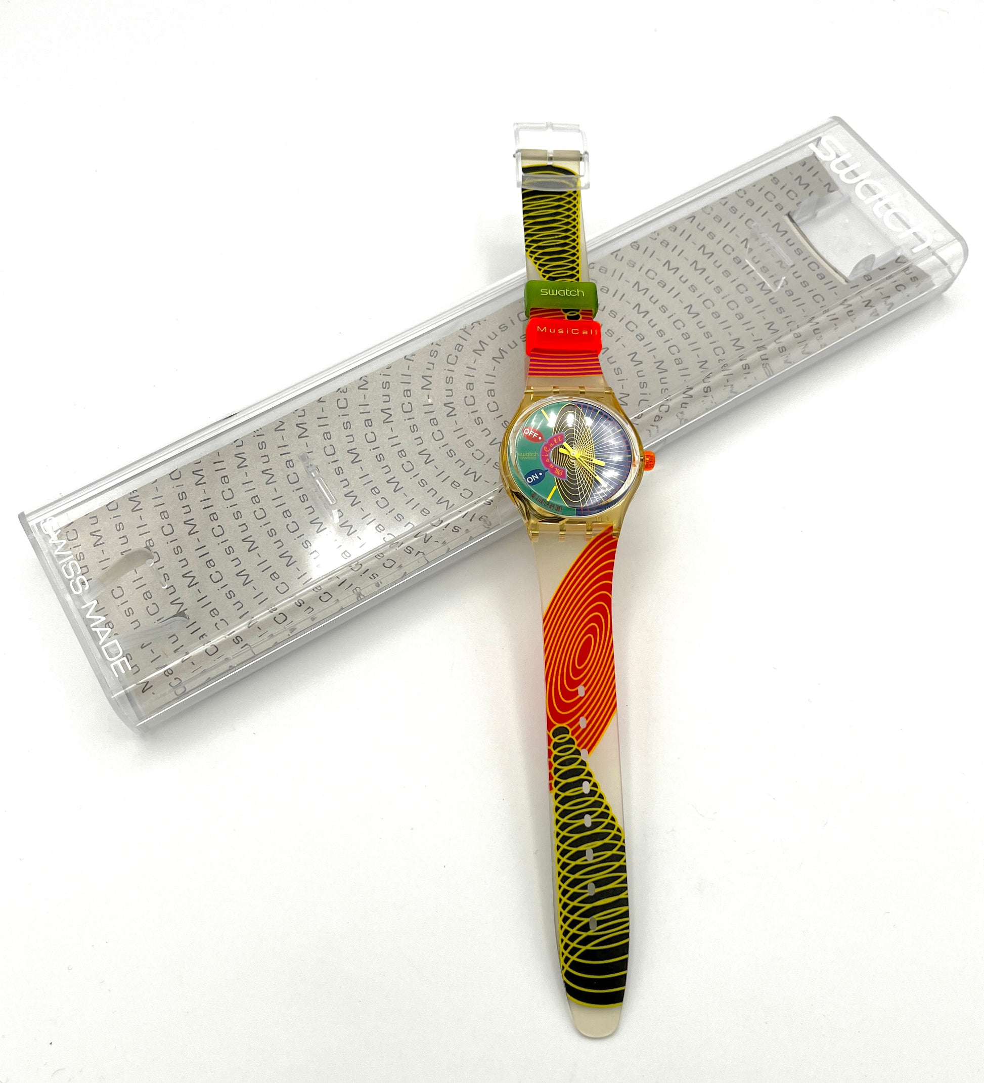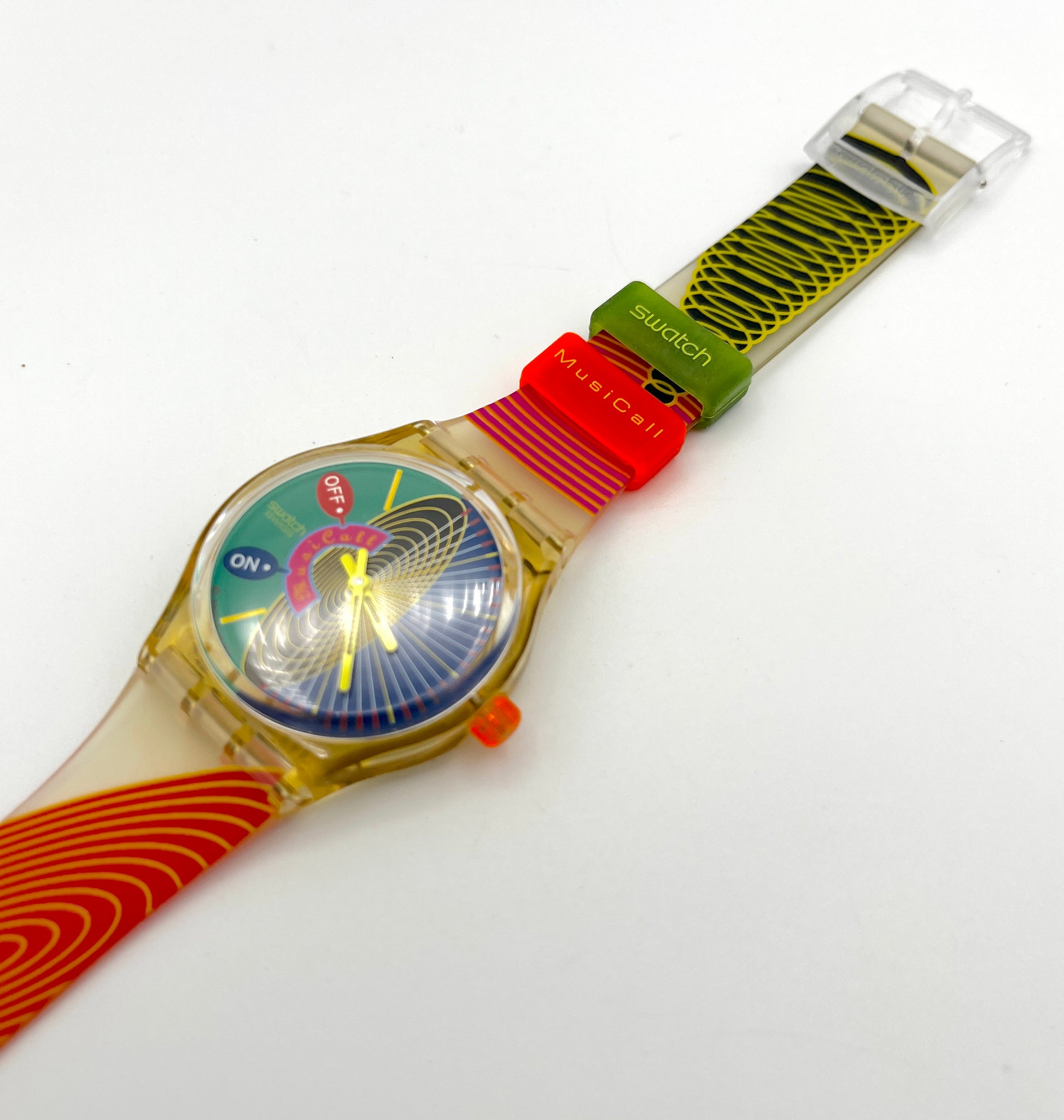 Colorful design – The colorful Swatch Musicall TAMBOUR is a classic from the early days of this model series. Musicall watches were produced from 1993 to 1998. They are the size of a normal Gent but also have an alarm function with a melody. Circles and ellipses are scattered all over the watch, a design typical of Swatch.
