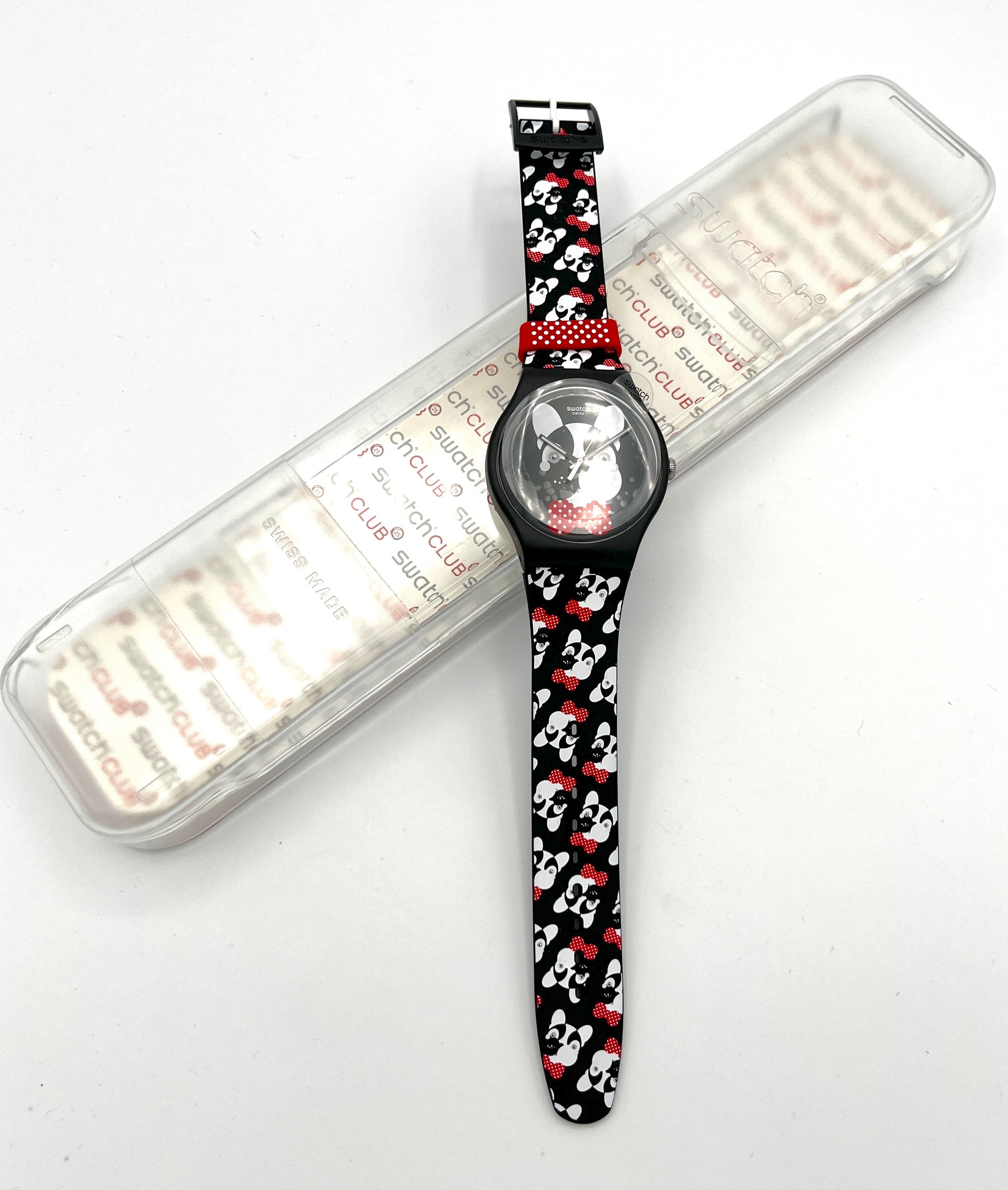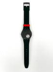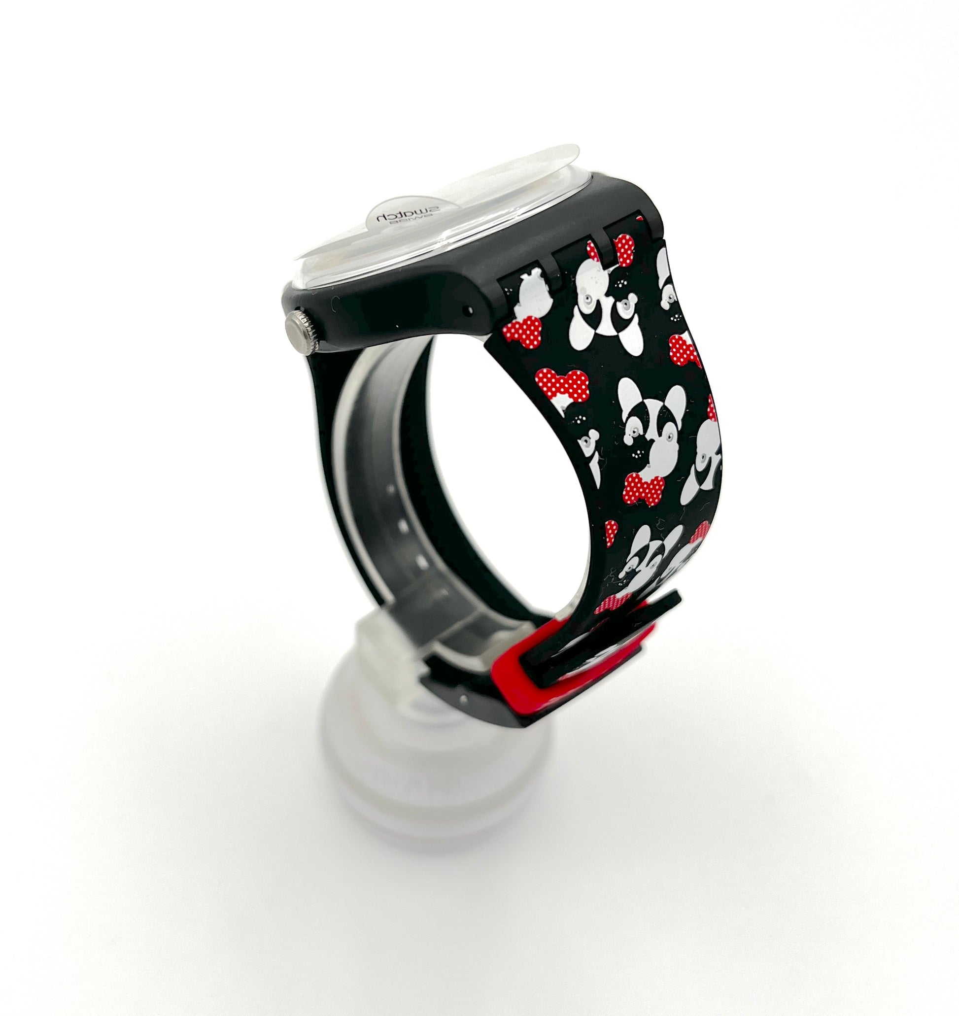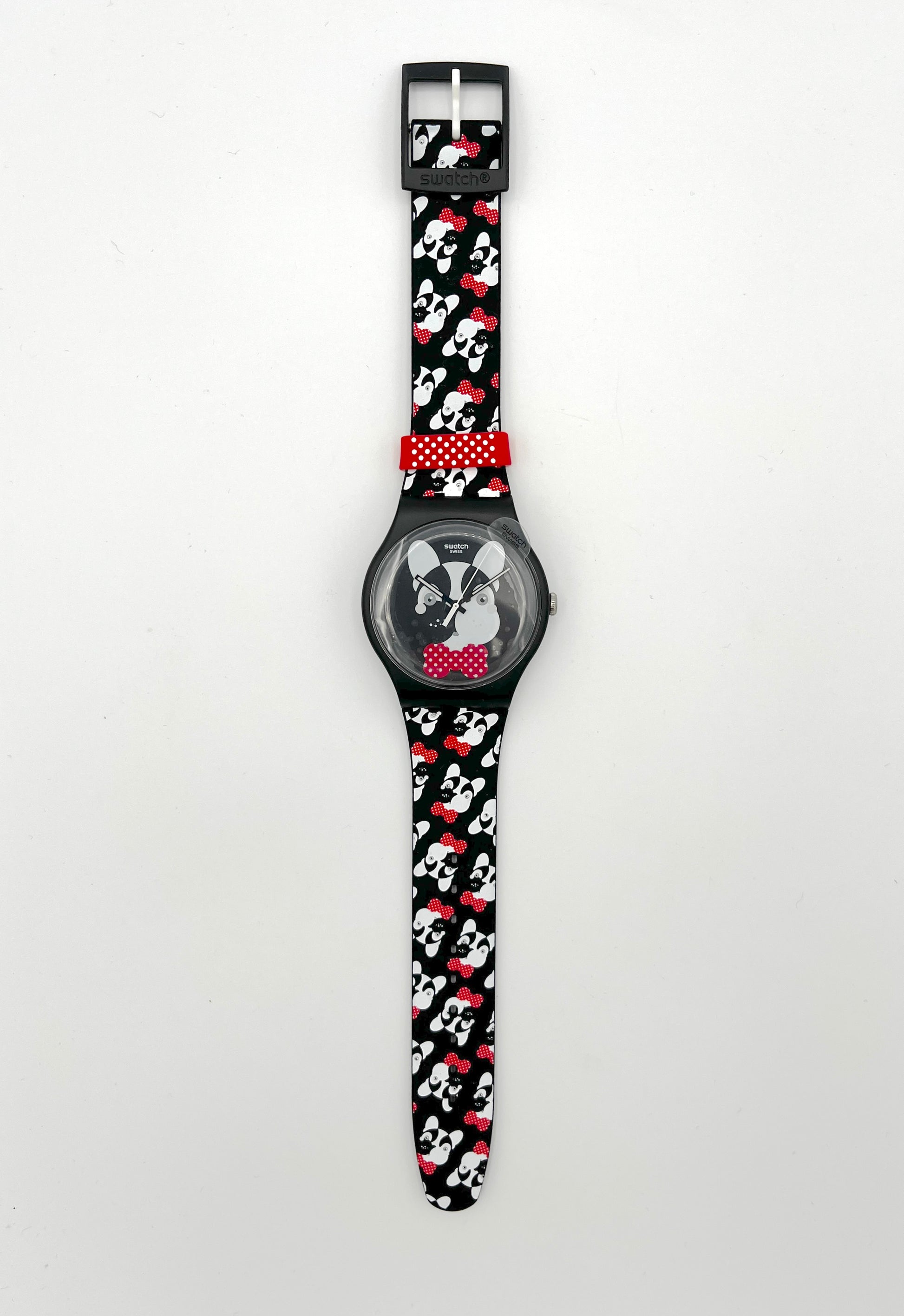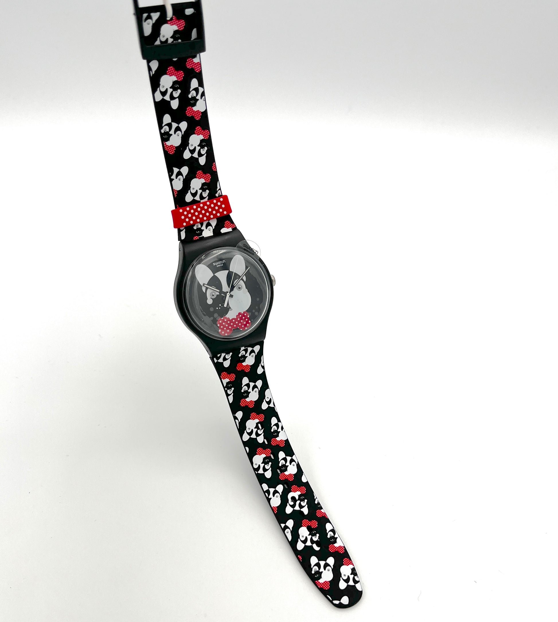 Swatch watch with a black strap featuring a dog design and red accents on a white background