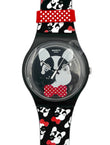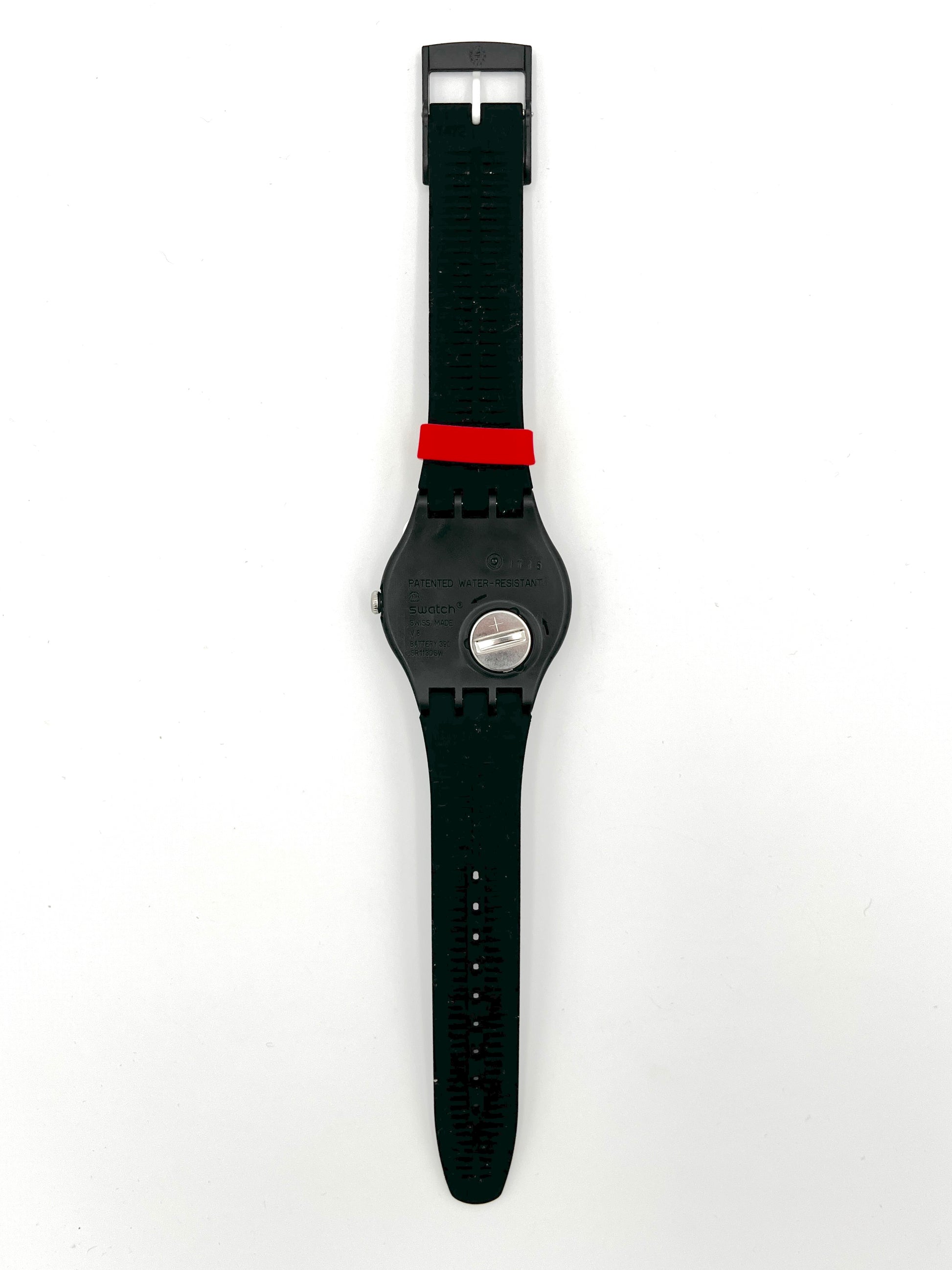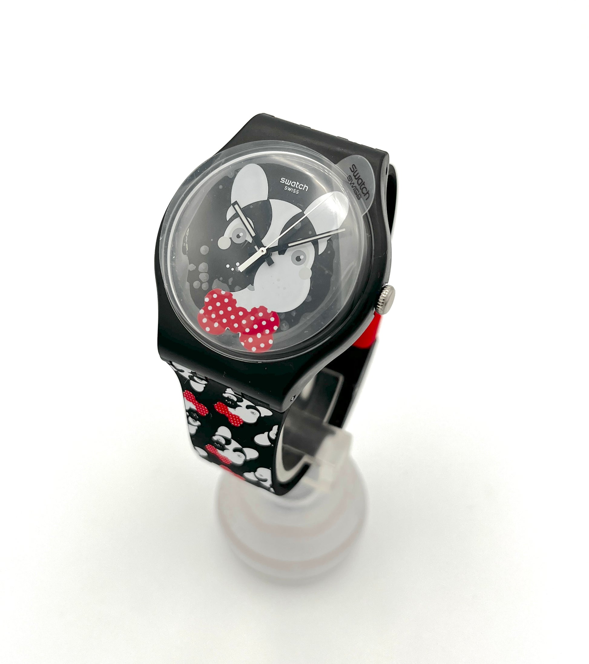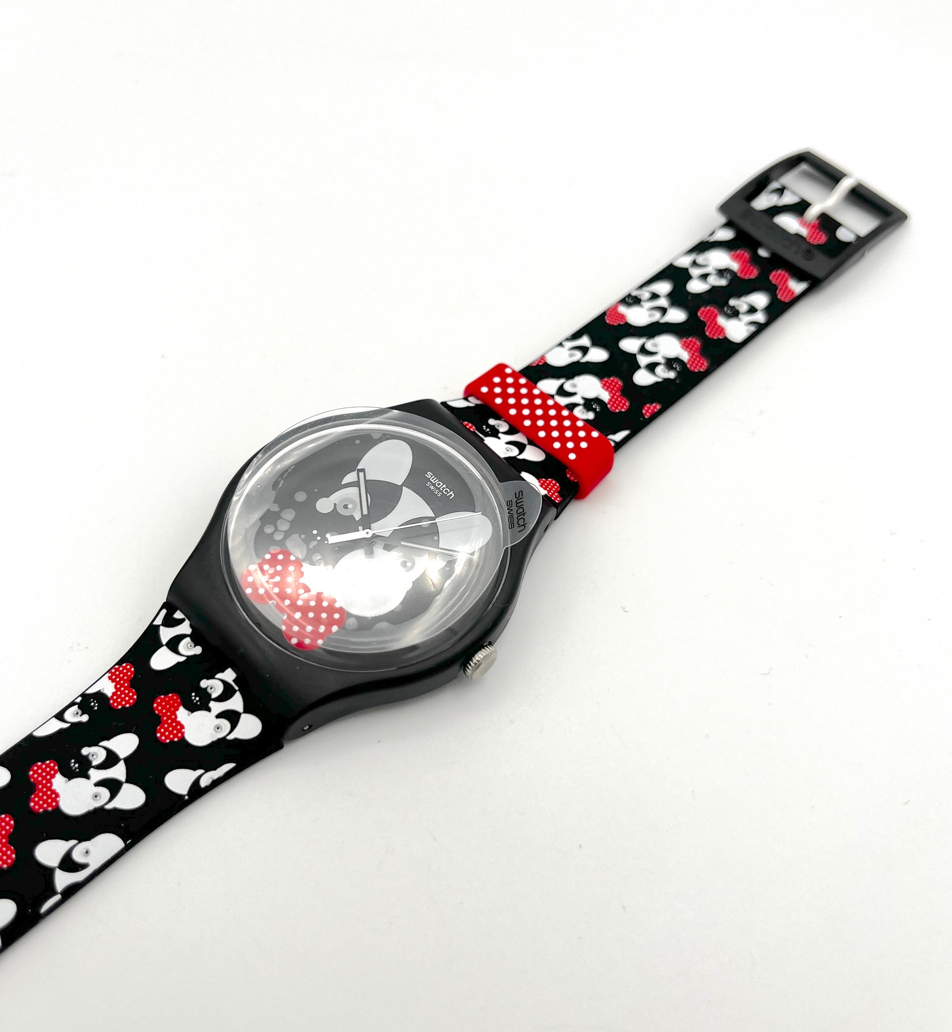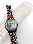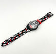 Swatch watch with a black strap featuring a dog design and red accents on a white background