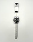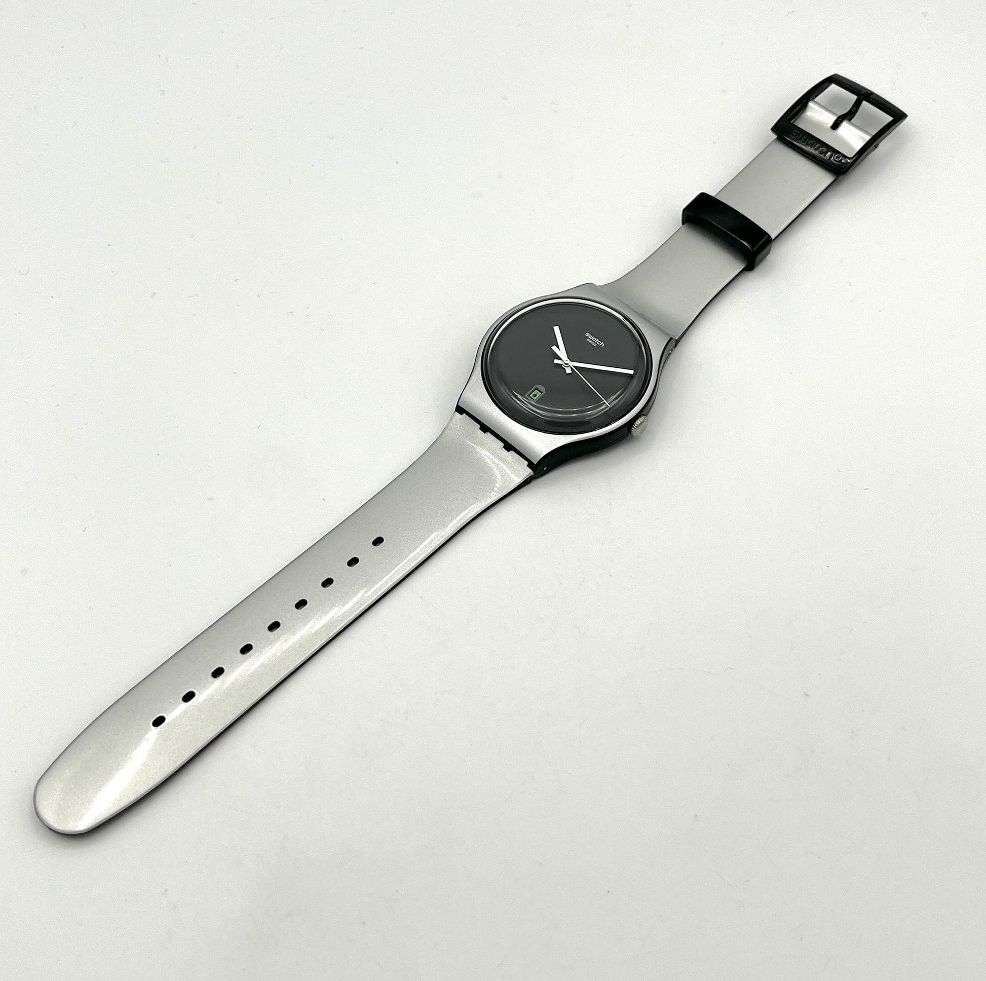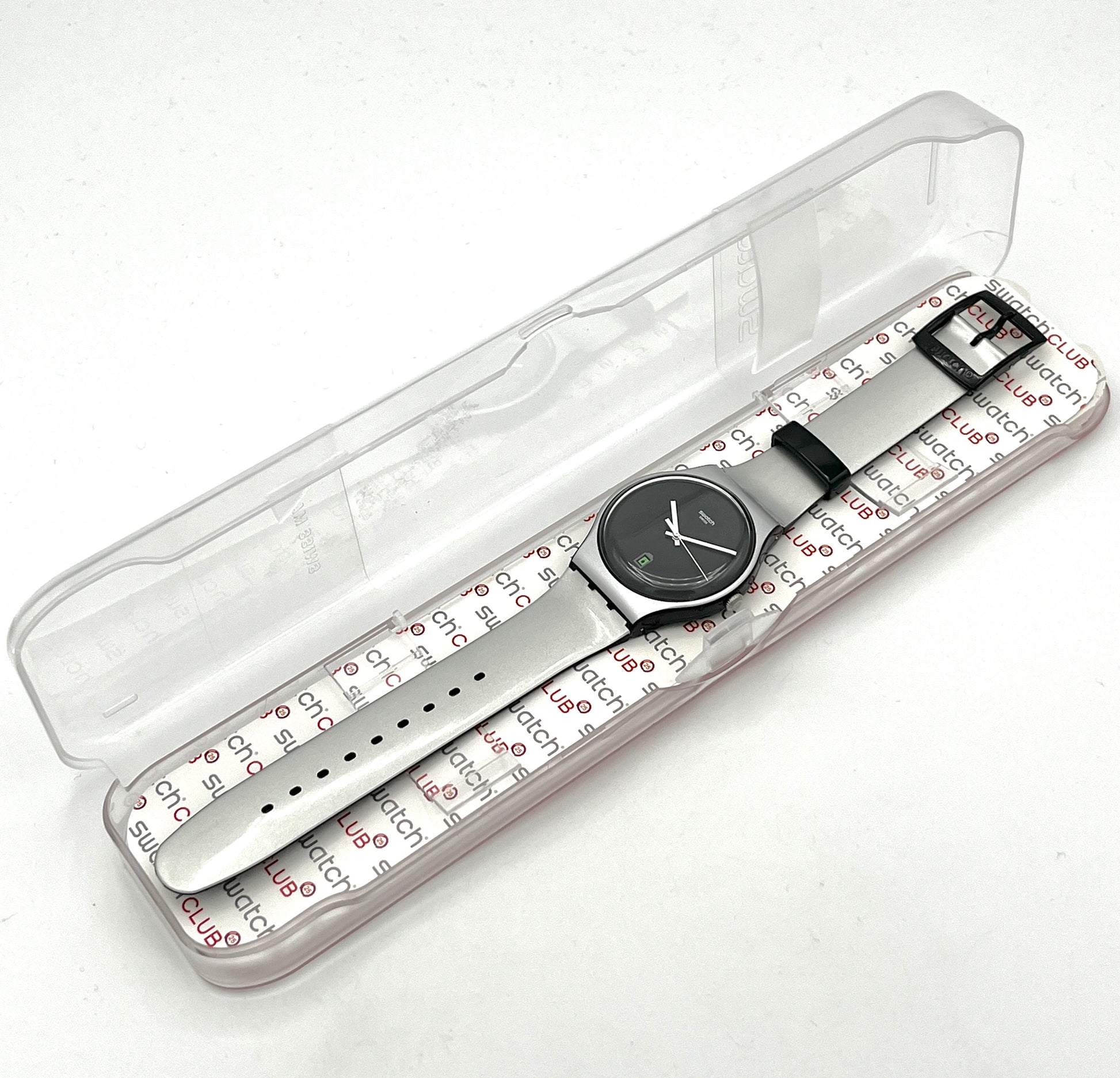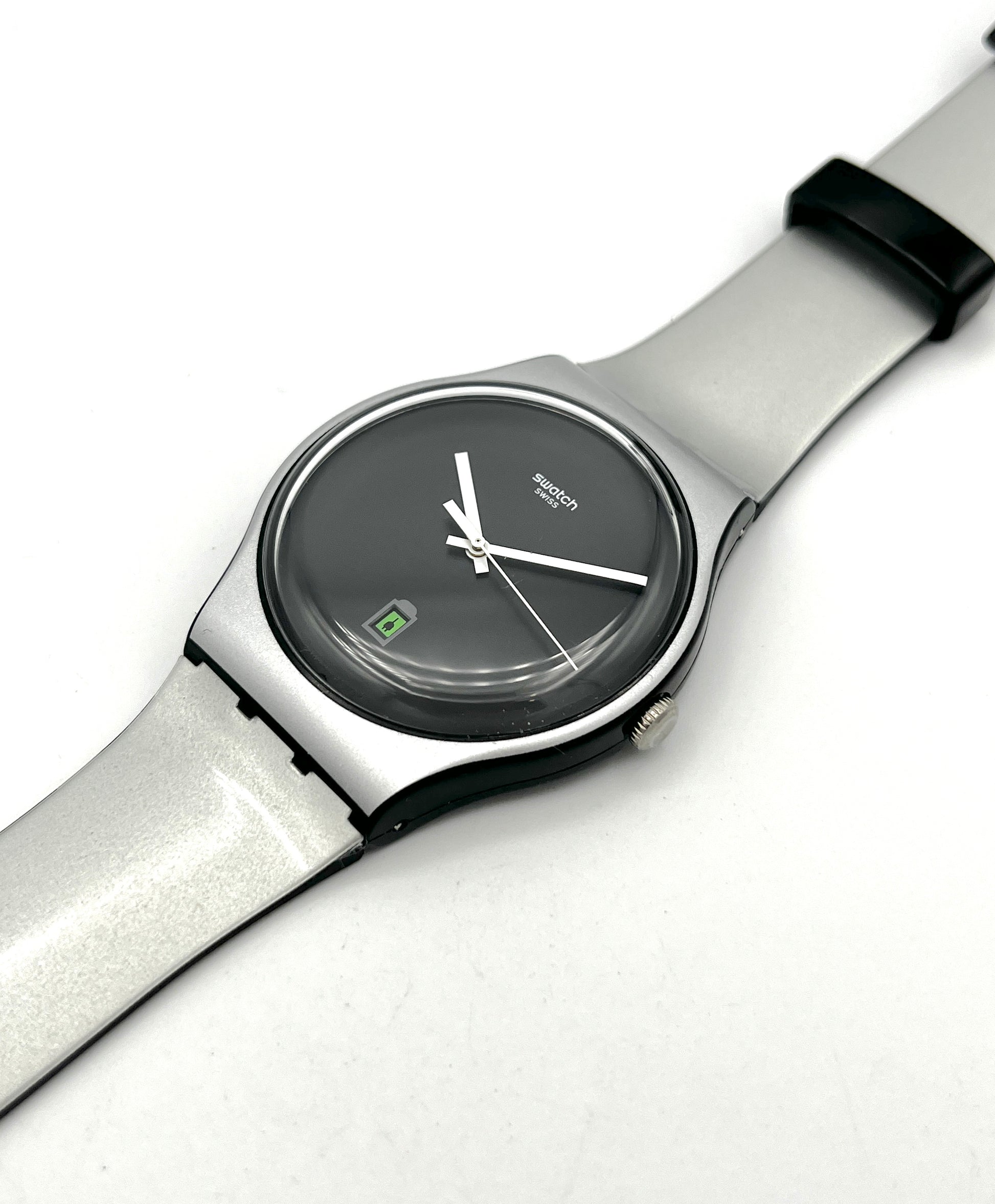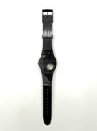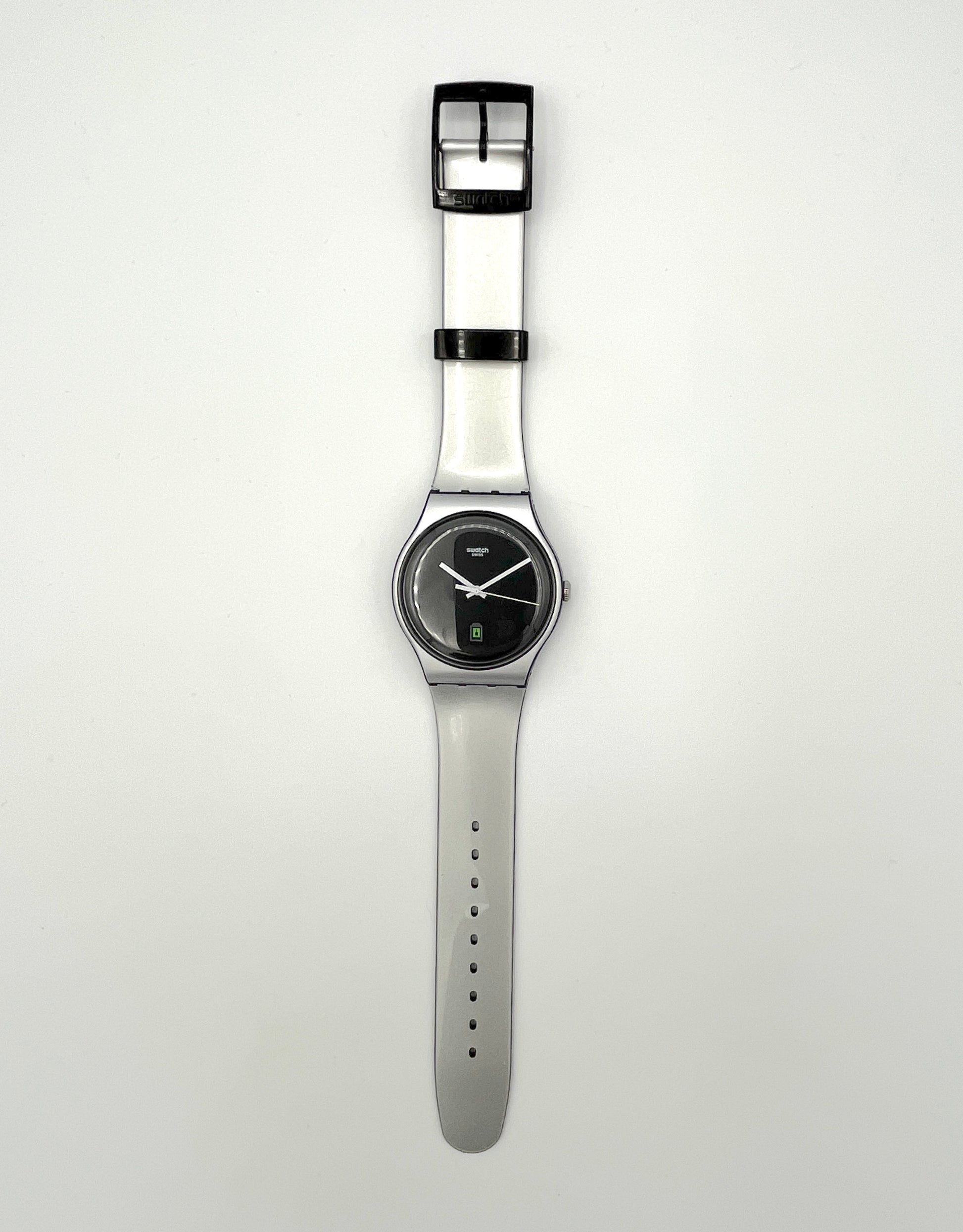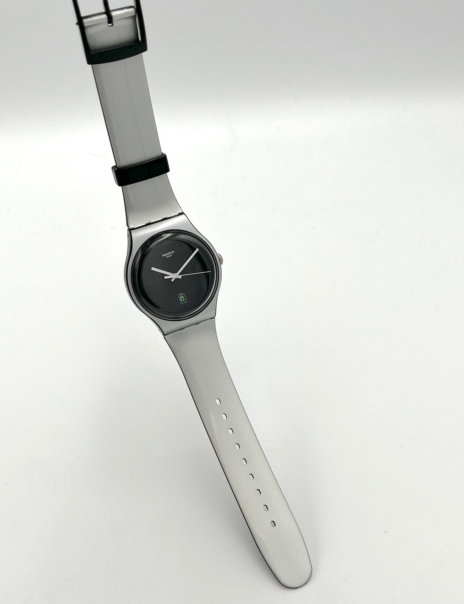 Simple Silver Design – The simple Swatch New Gent BE CHARGED has a black dial with white hands. The plastic case and strap are two-tone, with a silver-gray lacquer coating on the top of the black watch. At the 6 o'clock position is a window with three symbols (plug, lightning bolt, empty battery) that change daily.