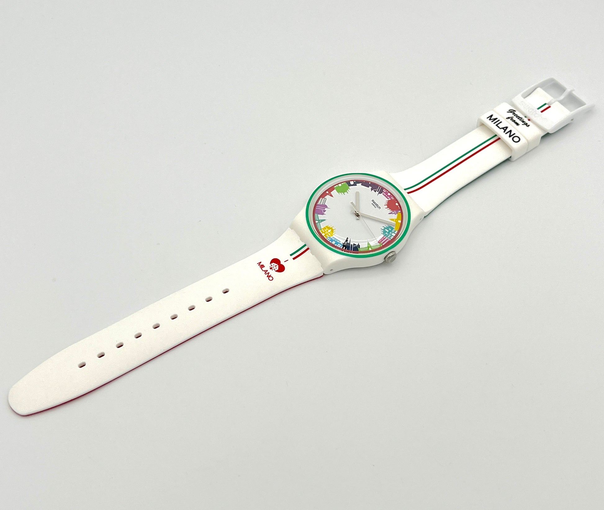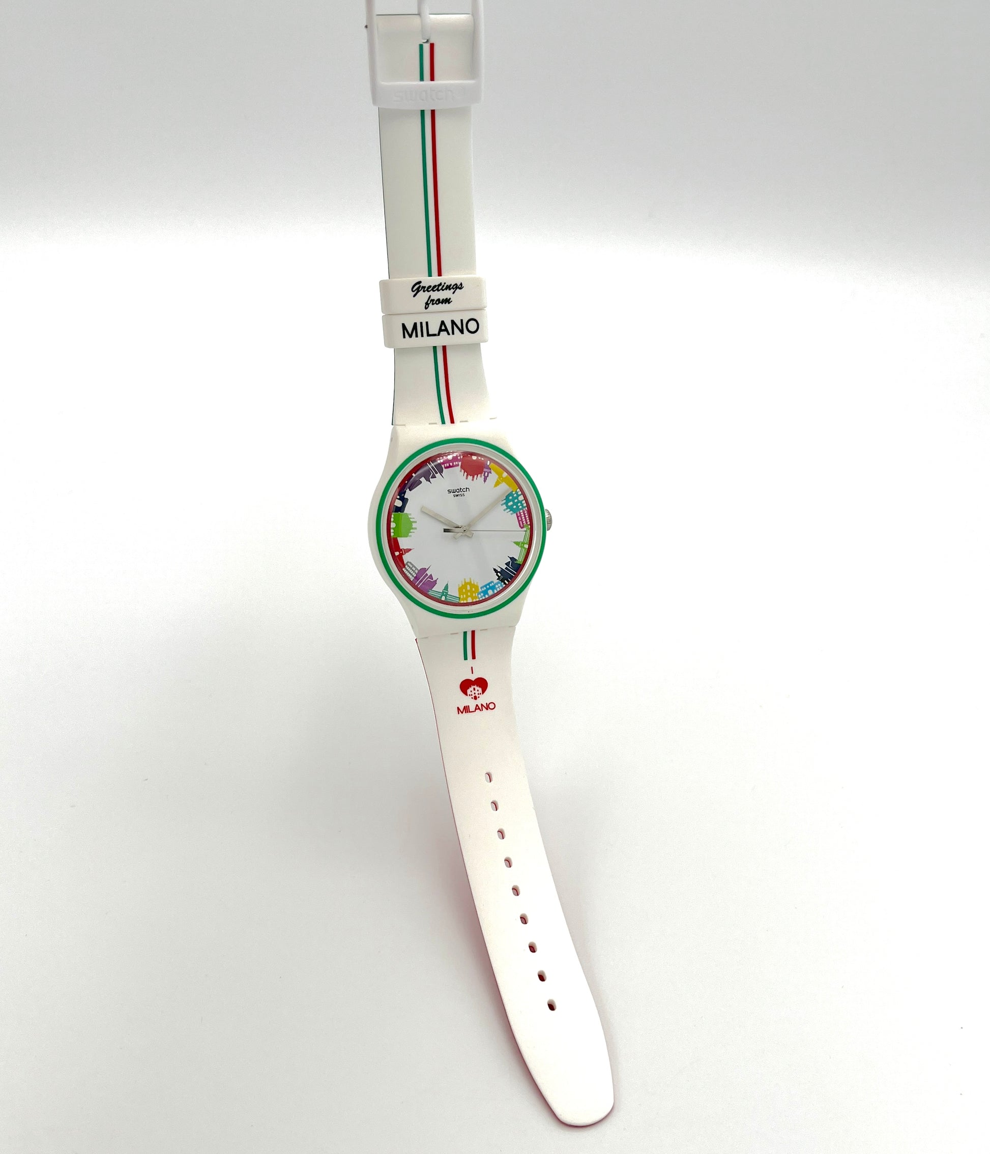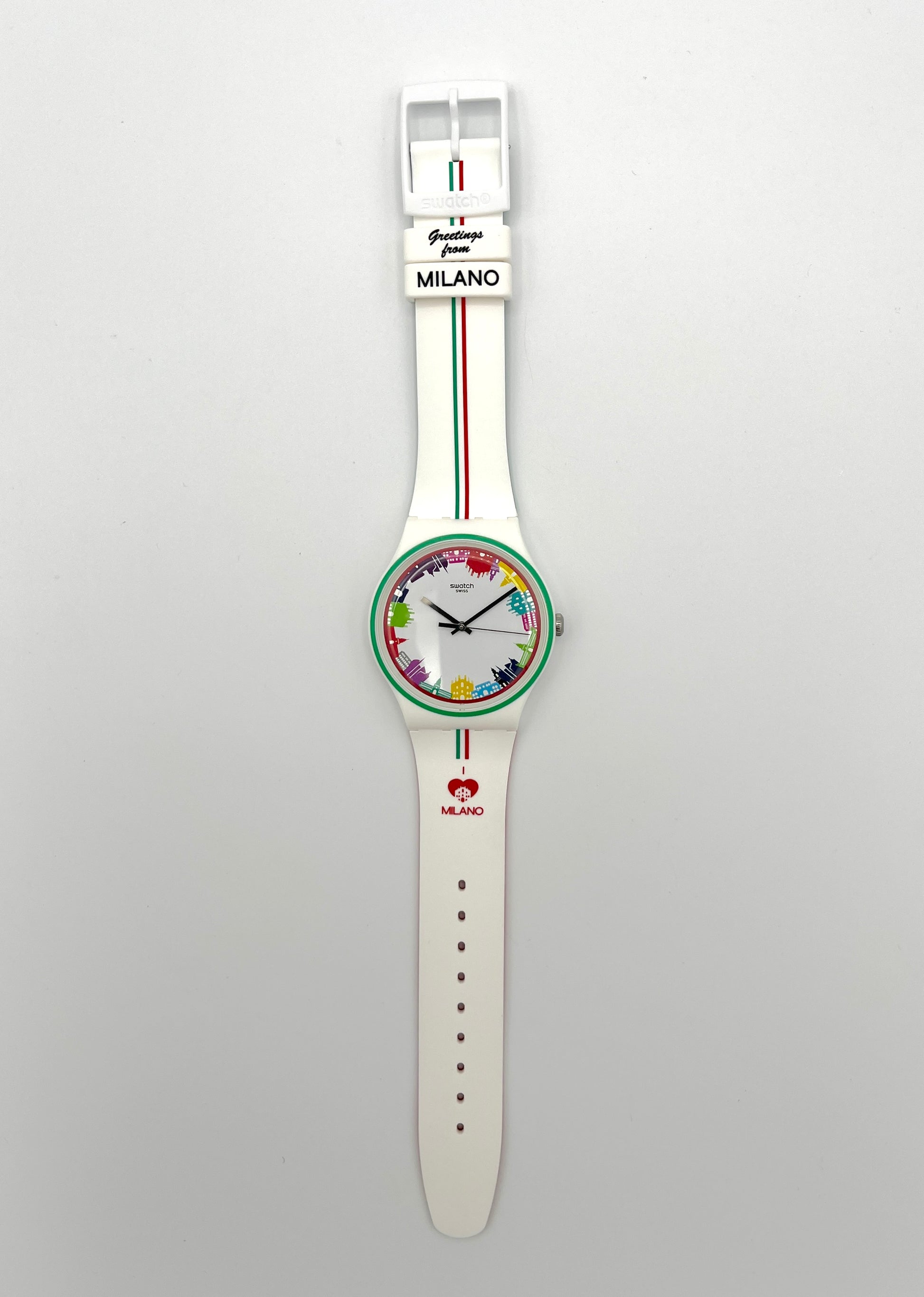 White Swatch watch with colorful design and 'I love Milano' text on a white background