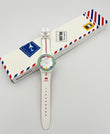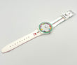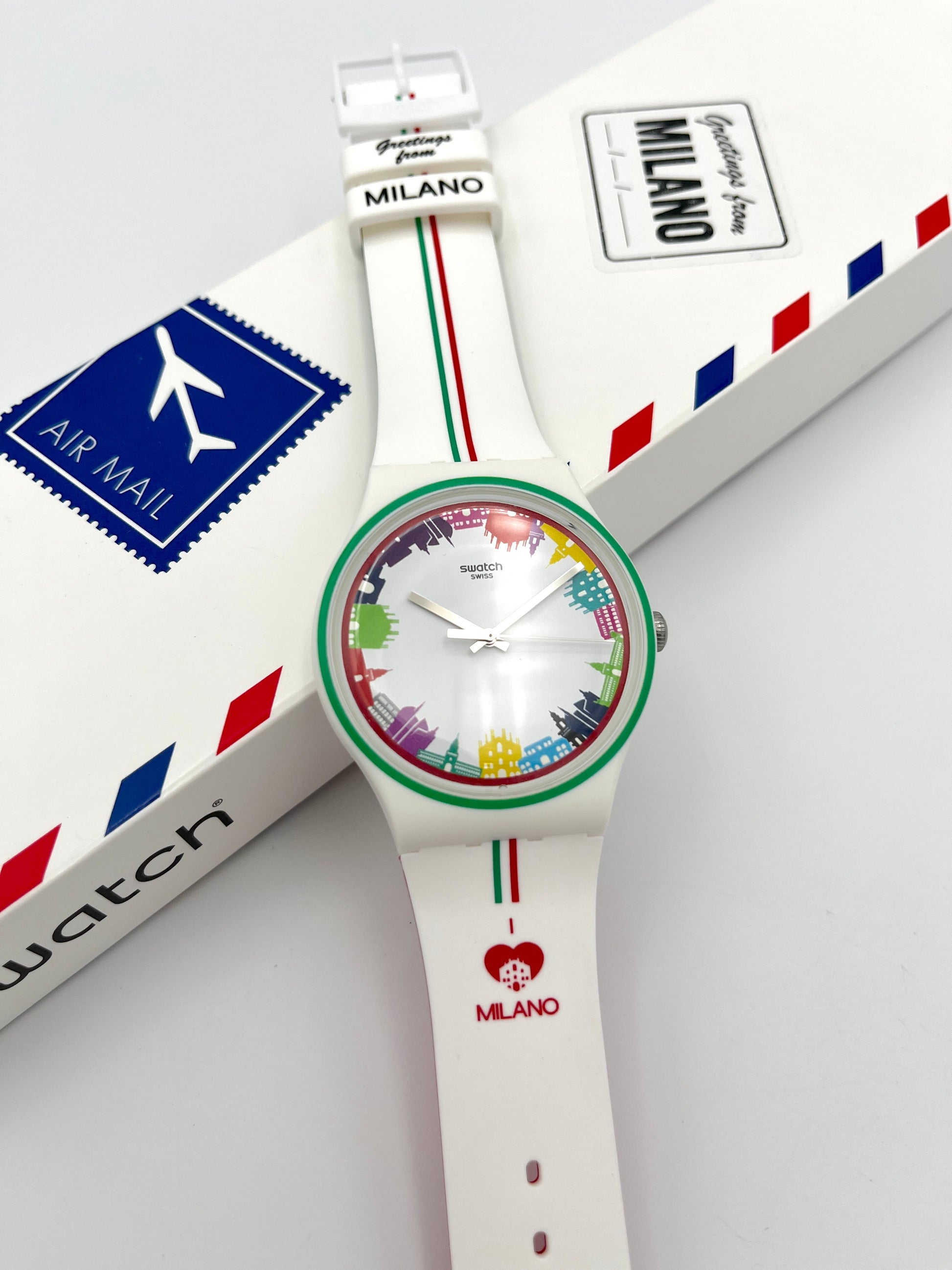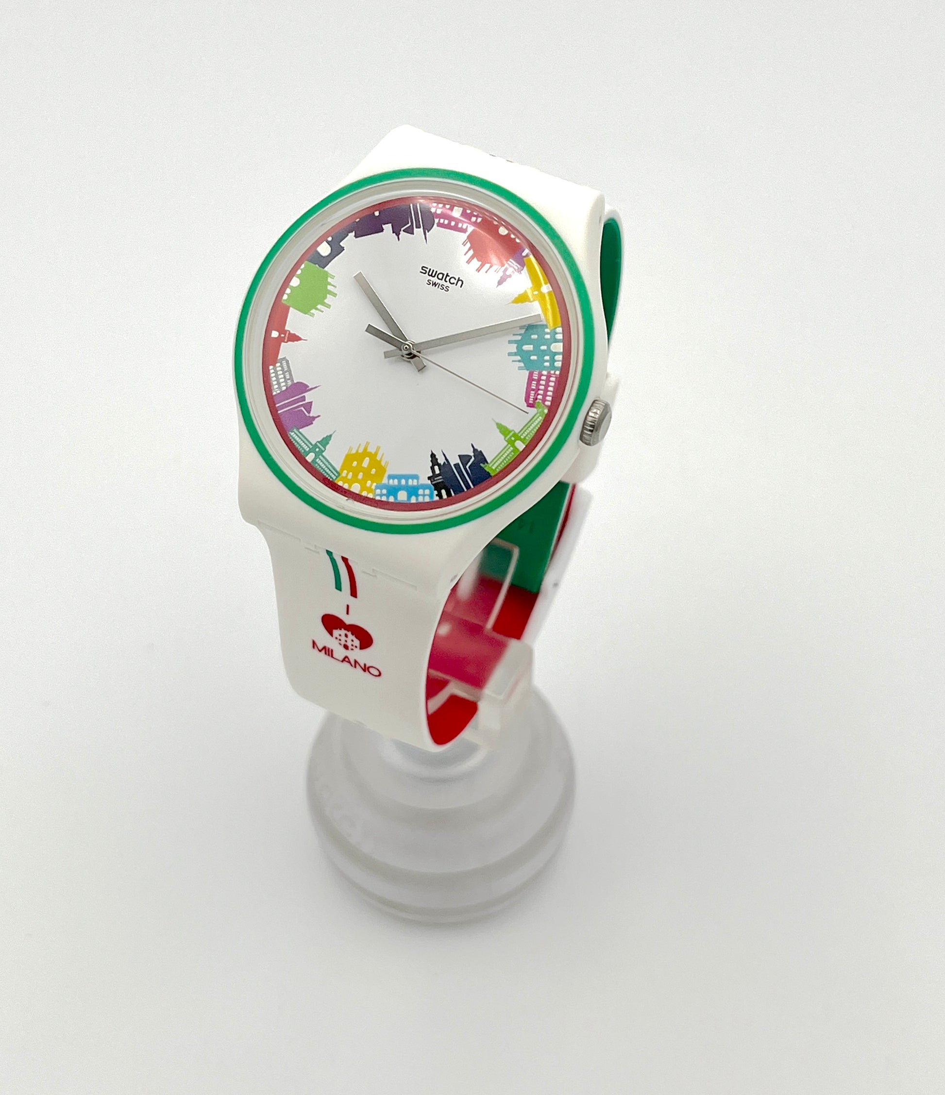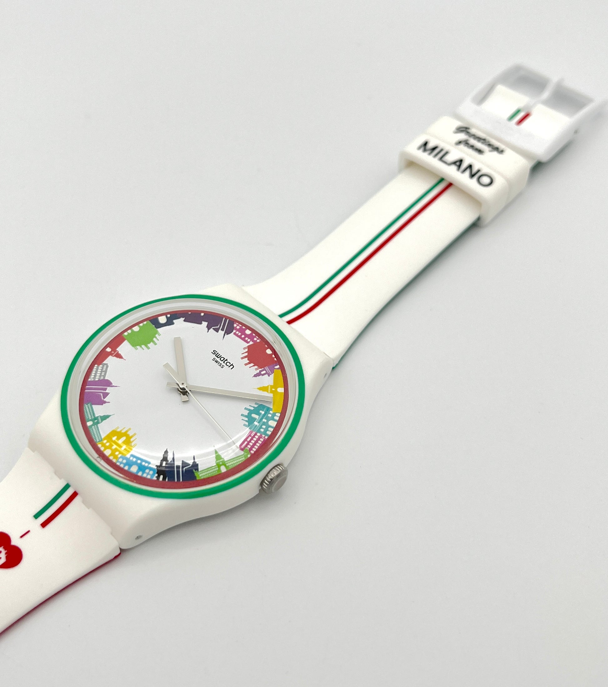 White Swatch watch with colorful design and 'I love Milano' text on a white background