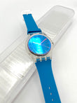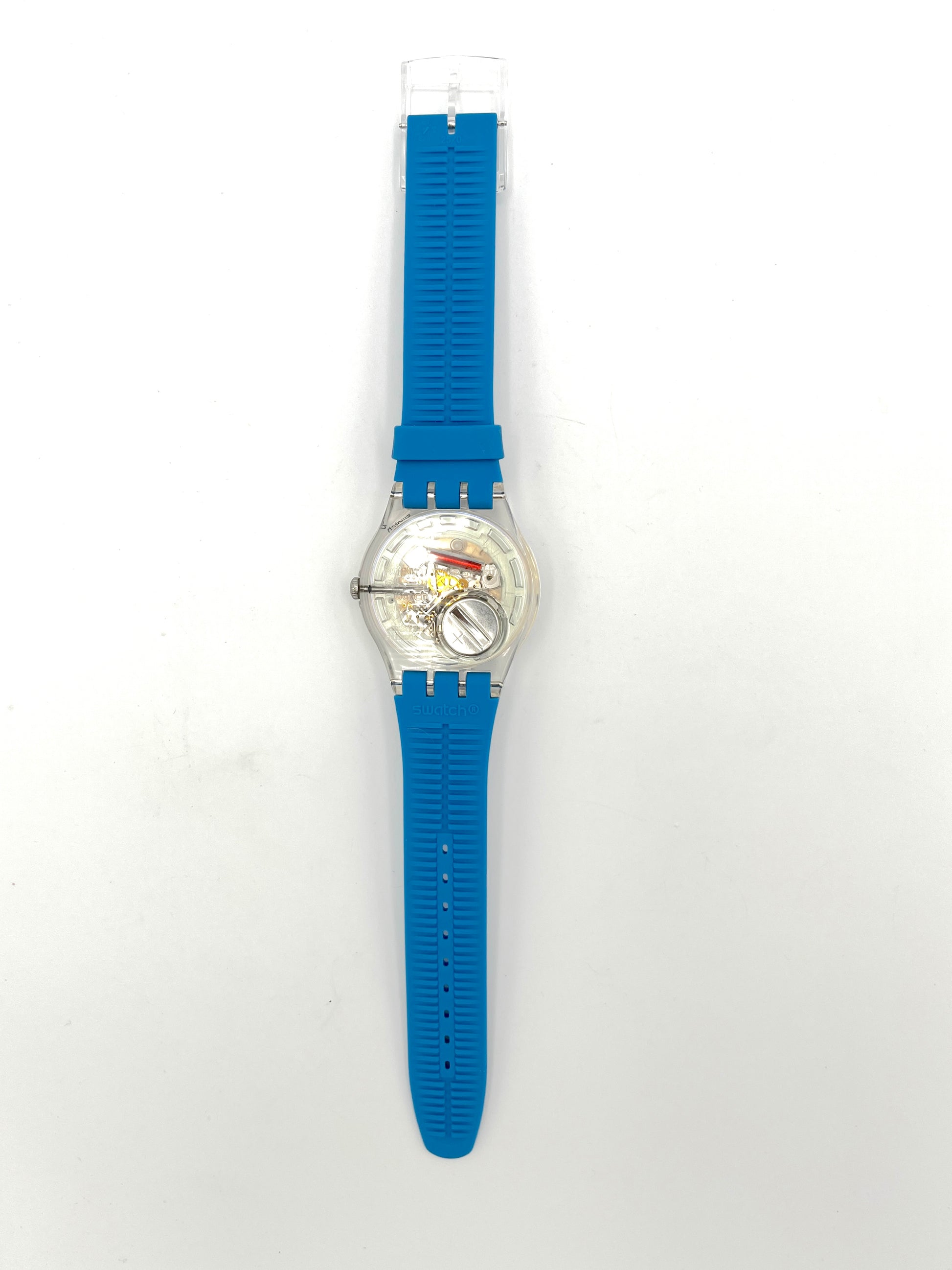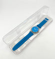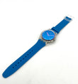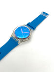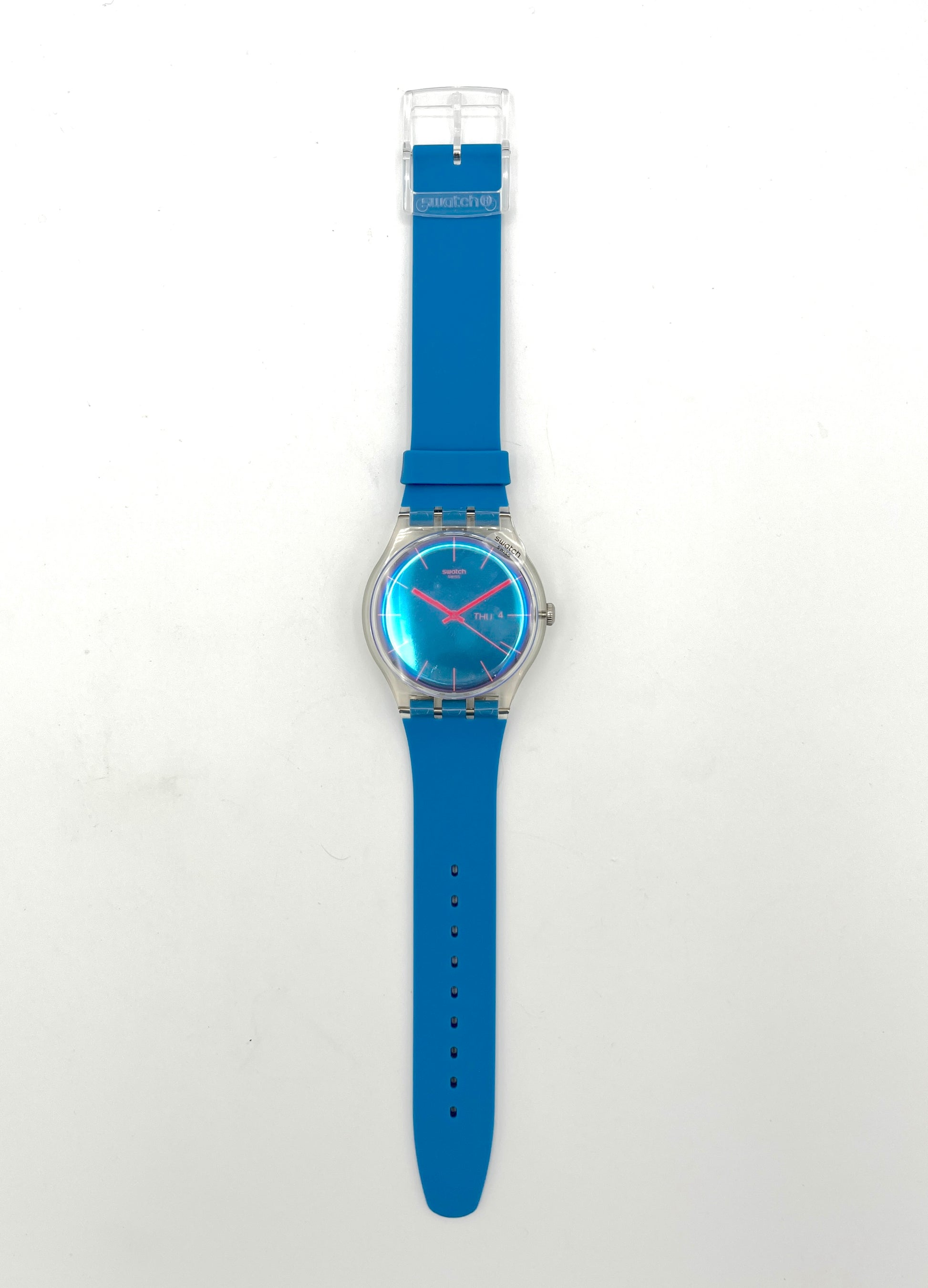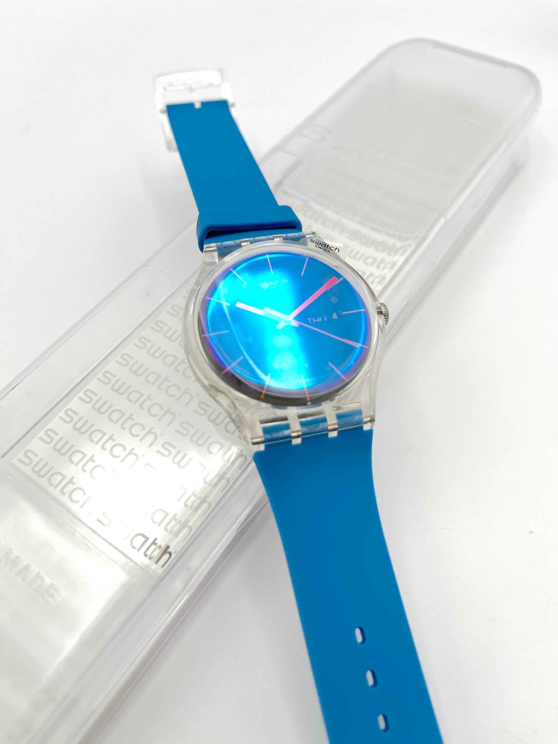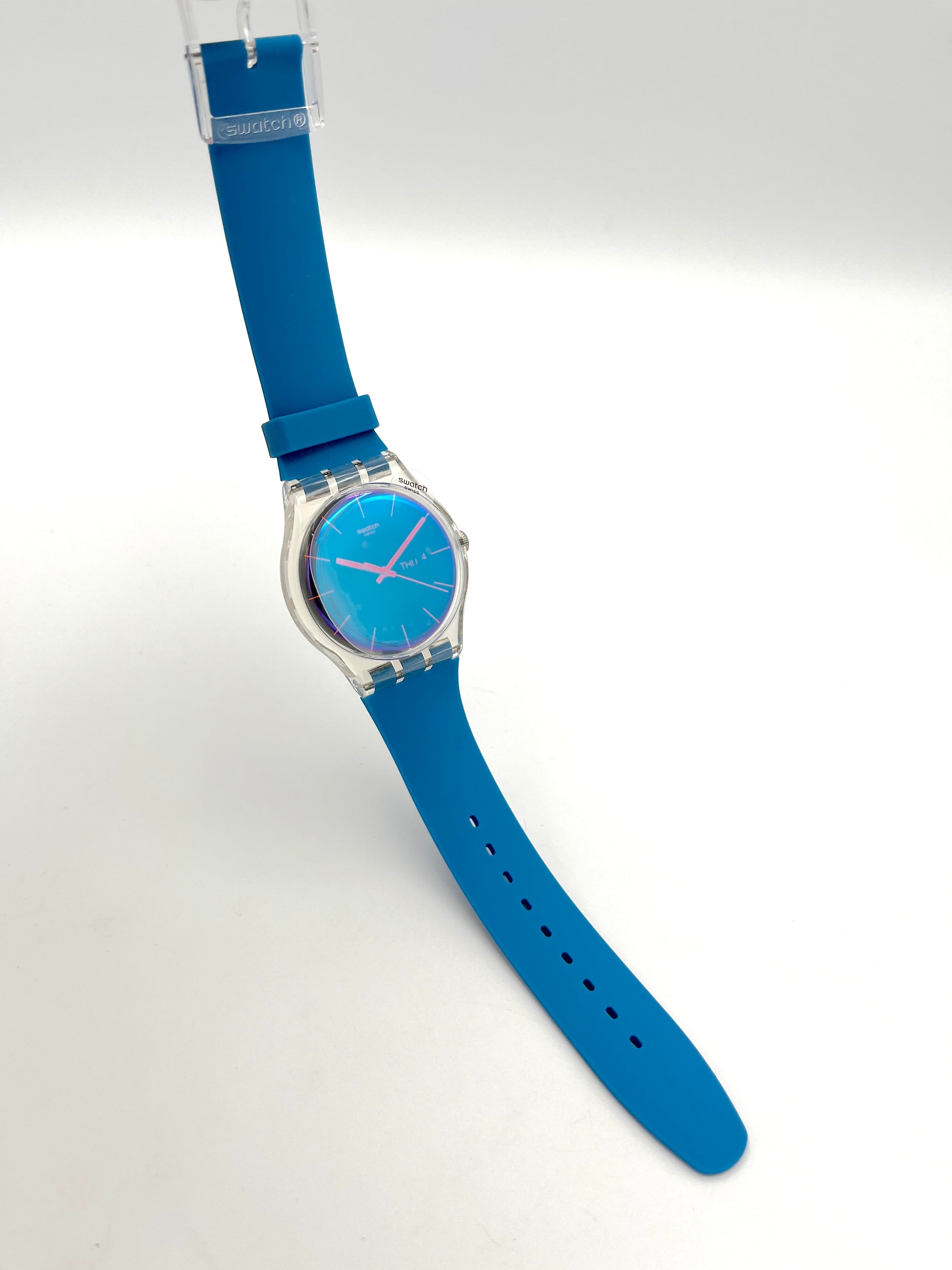 Shimmering Dial – The Swatch New Gent POLABLUE combines monochrome with a fascinating color gradient. Depending on the incidence of light, the dial shimmers in the colors of the rainbow. The hands and bar indices are created in neon pink. The case and buckle of the blue silicone strap are made of transparent plastic.