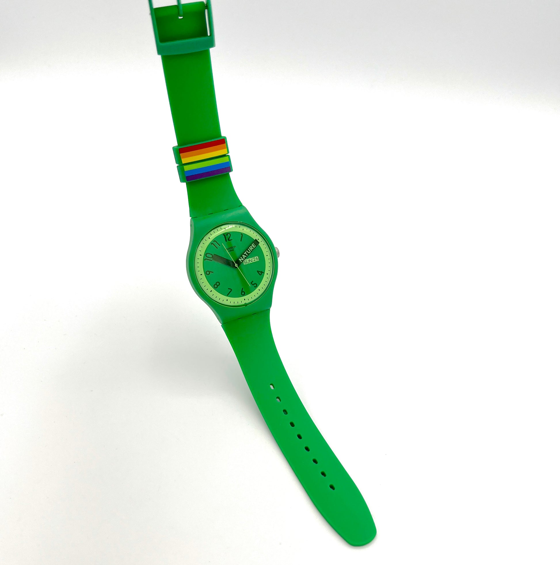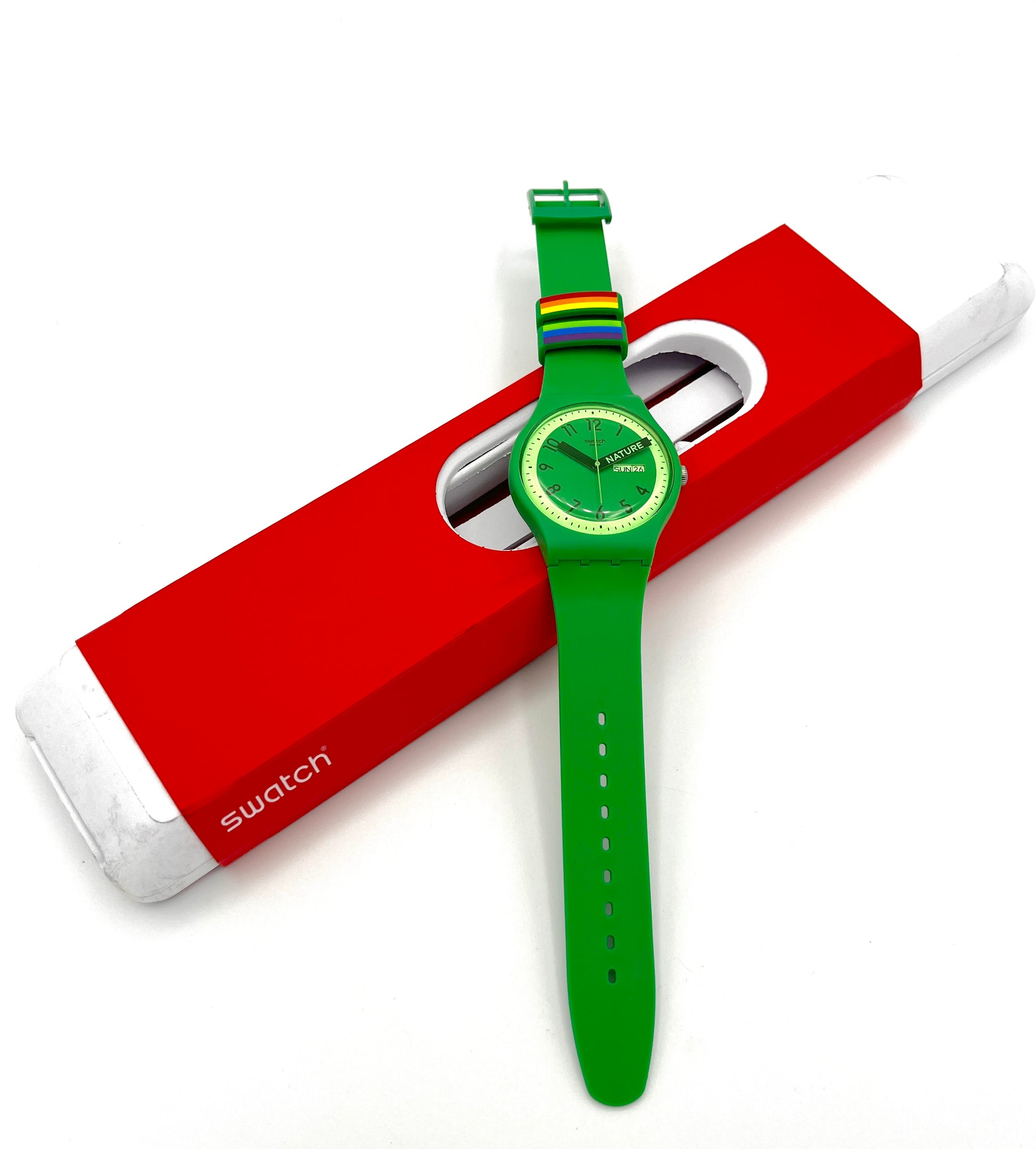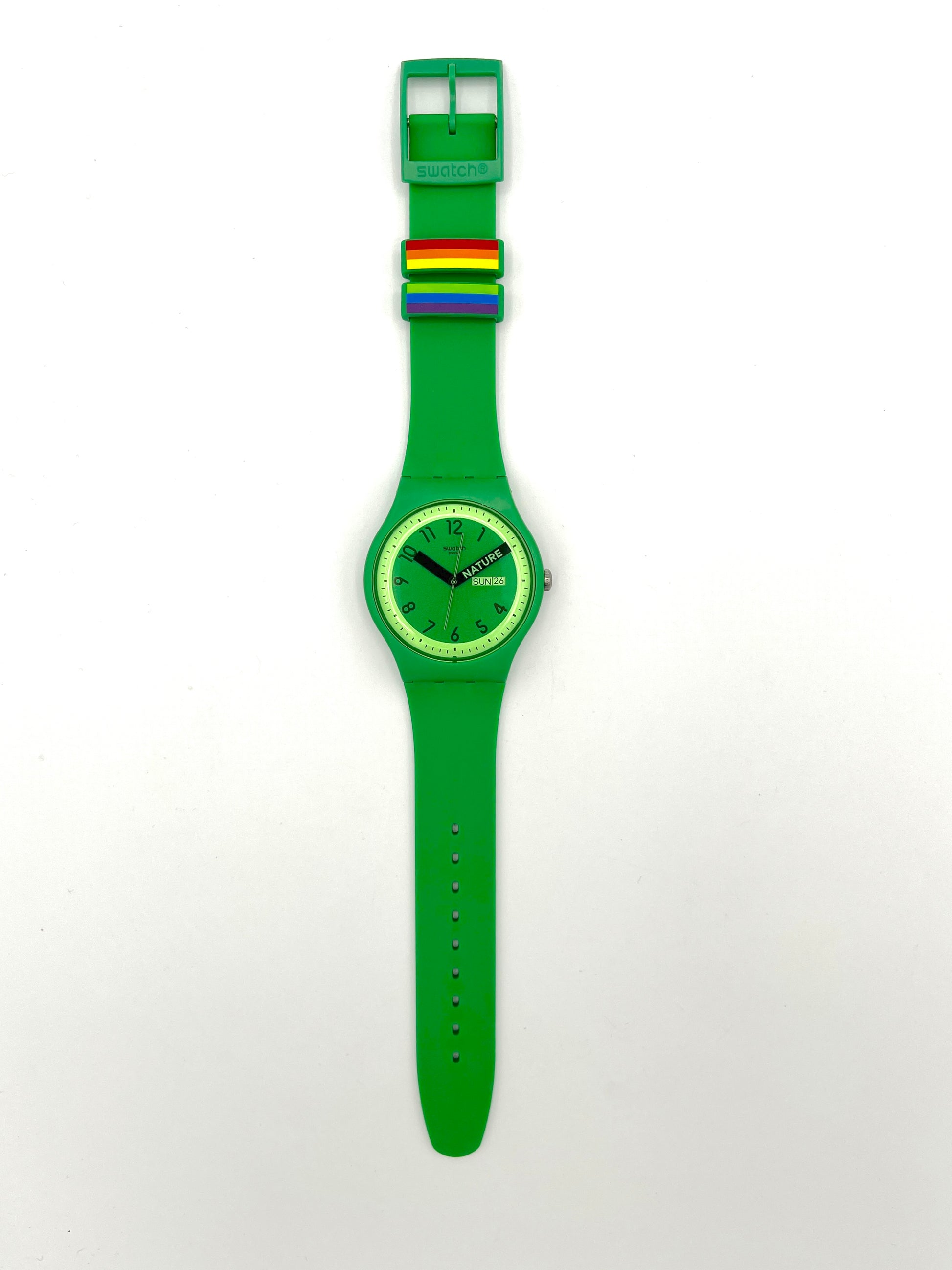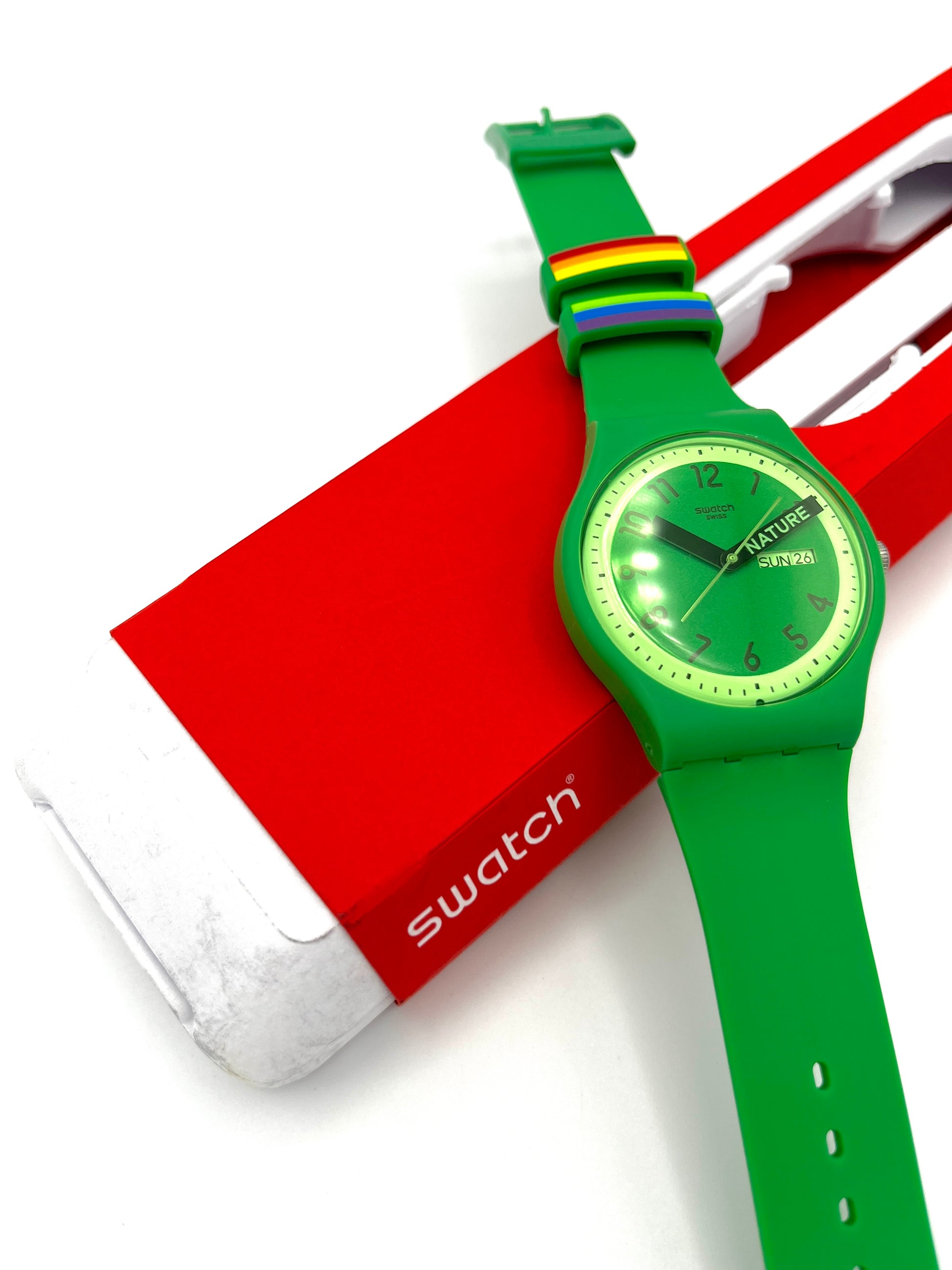 Swatch Pride Collection 2023 – This collection stands for people, cultures, ideas, genders, talents, beliefs, and personalities. The Swatch Pride Collection 2023 presents seven models in the six colors of the rainbow, symbolizing the iconic rainbow flag of the LGBT+ movement. The New Gent PROUDLY GREEN is created entirely in green, the color of nature. The case is made of bio-based plastic, a material produced from renewable raw materials. The dial is the same color and features black hands, numbers, and indices. Eye-catching details include the symmetrical second hand, symbolizing equality, and the word β€œNature” on the minute hand. The soft, supple strap with a pin buckle is made of green silicone, and the Pride flag is printed on both loops.Β