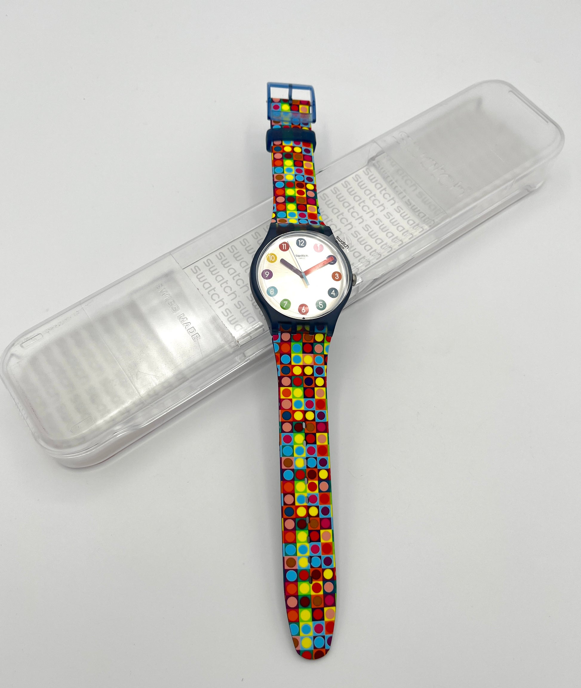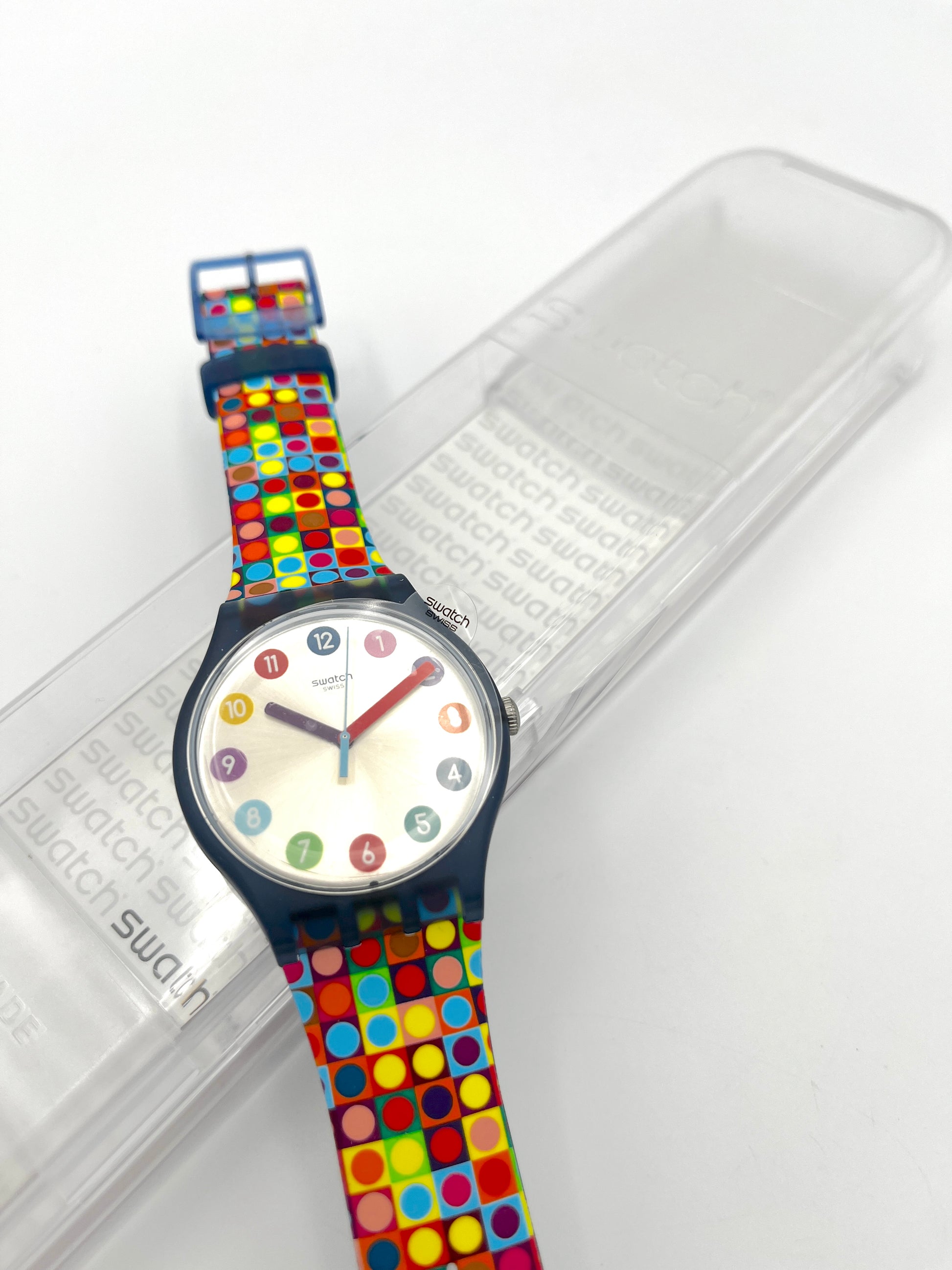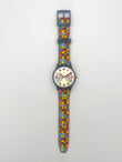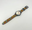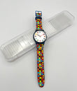 Vibrant colors – The strap has a dotted design of colored dots and on the silver dial the hour markers are dotted colored numbers.