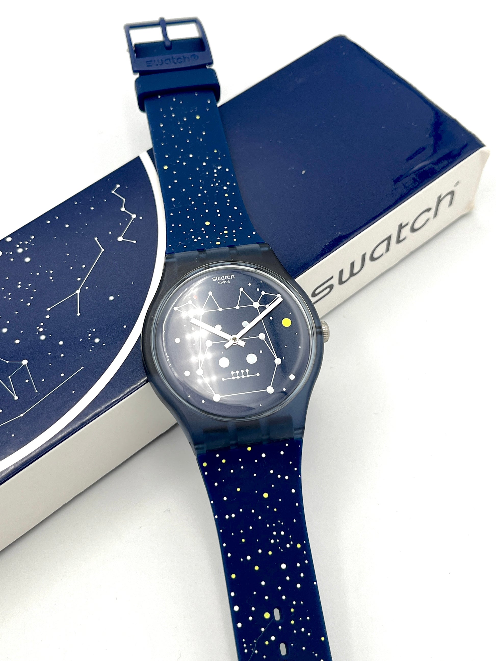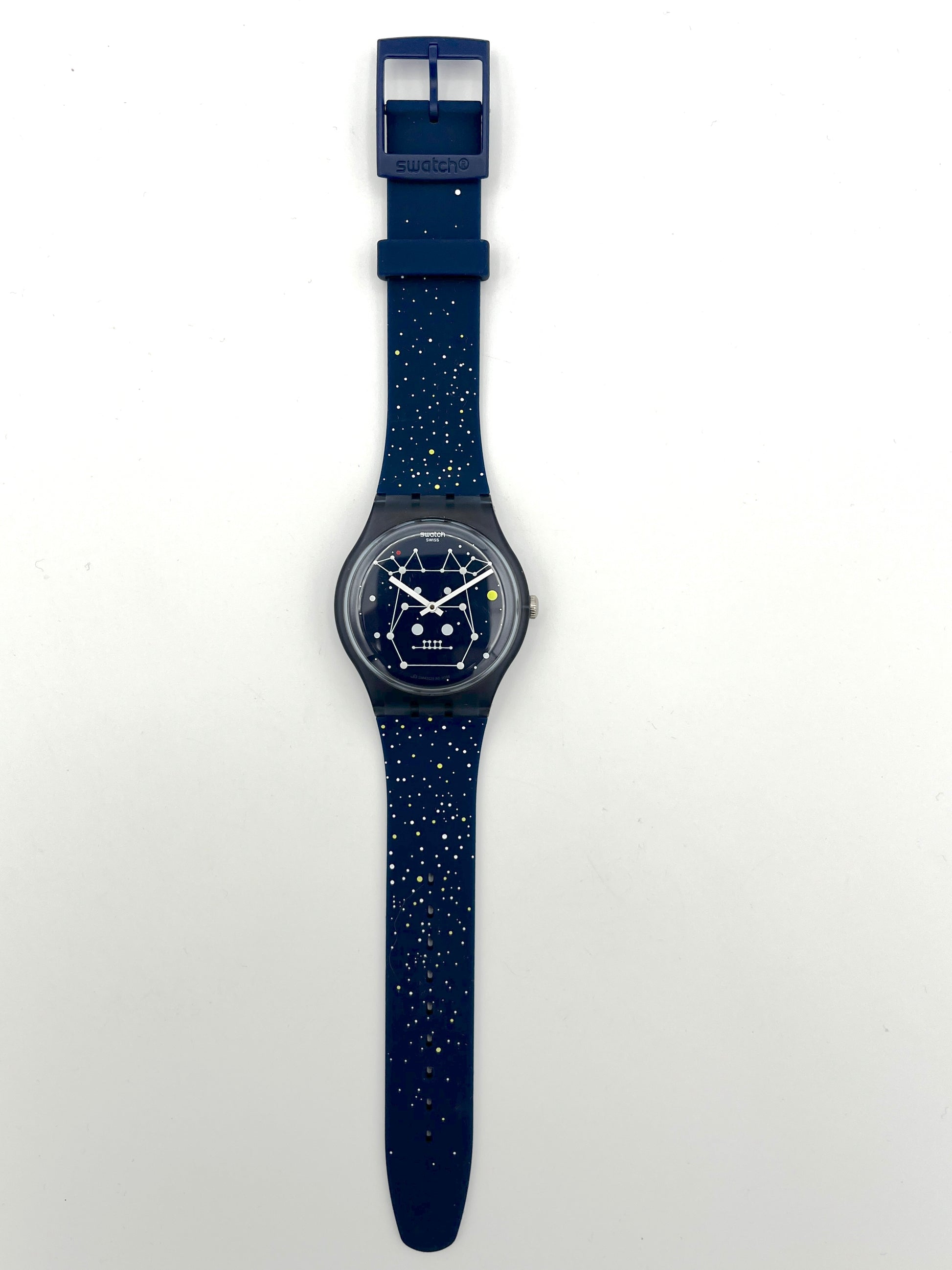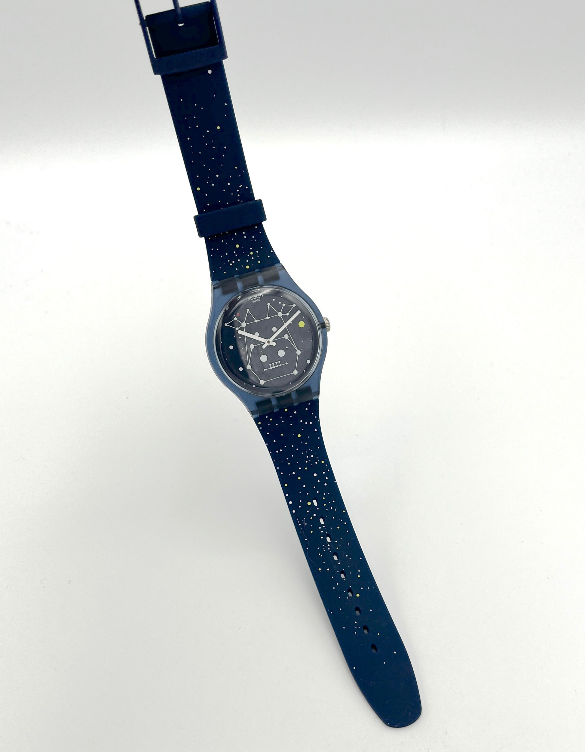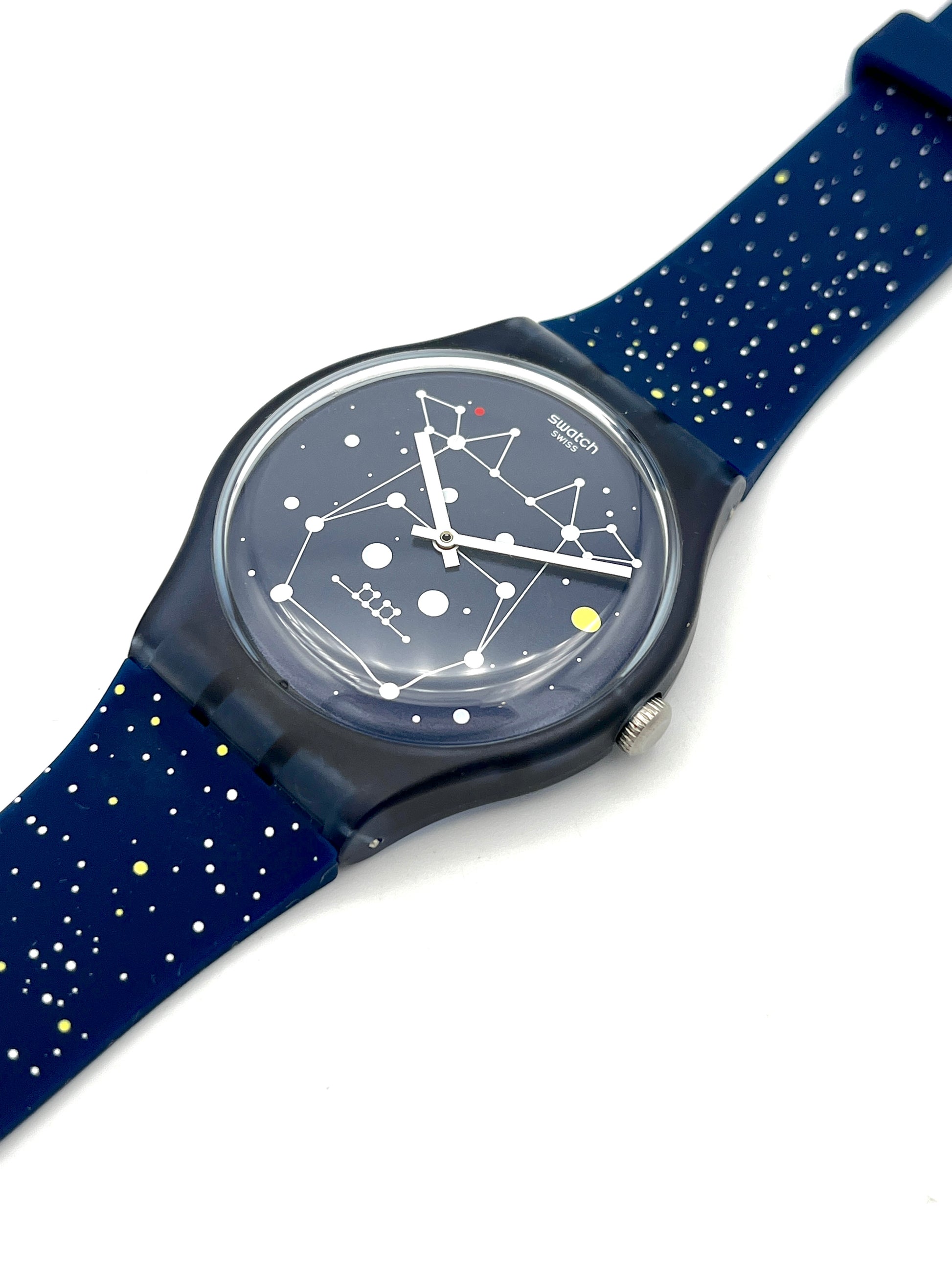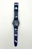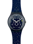 Swatch watch with starry night design on a white background