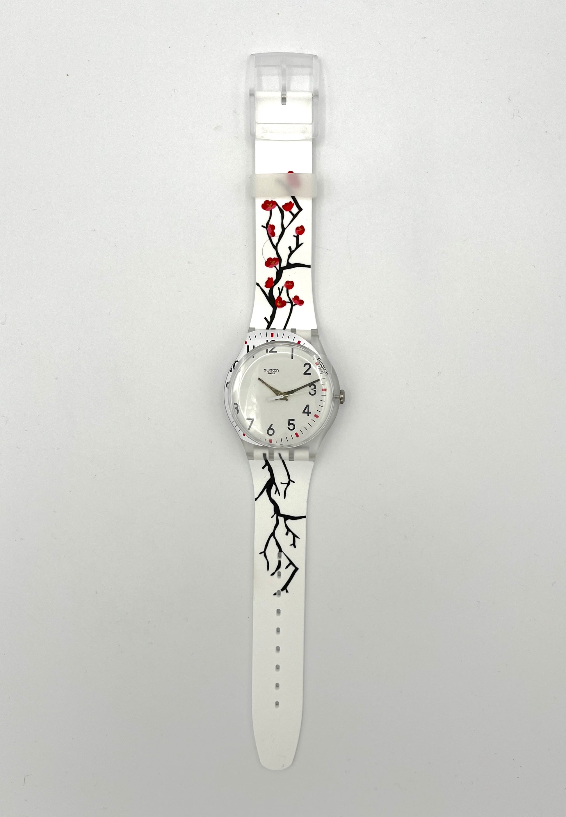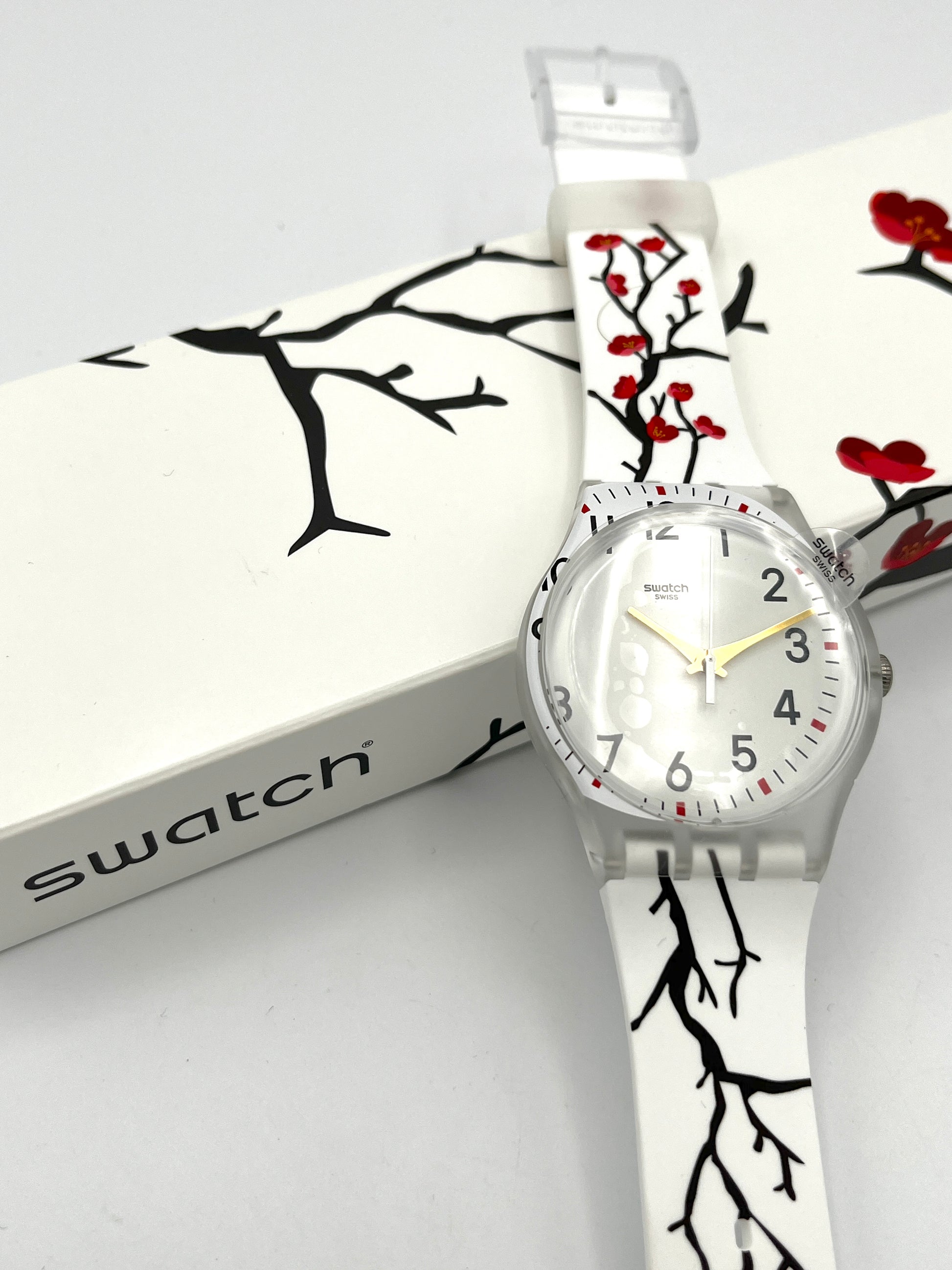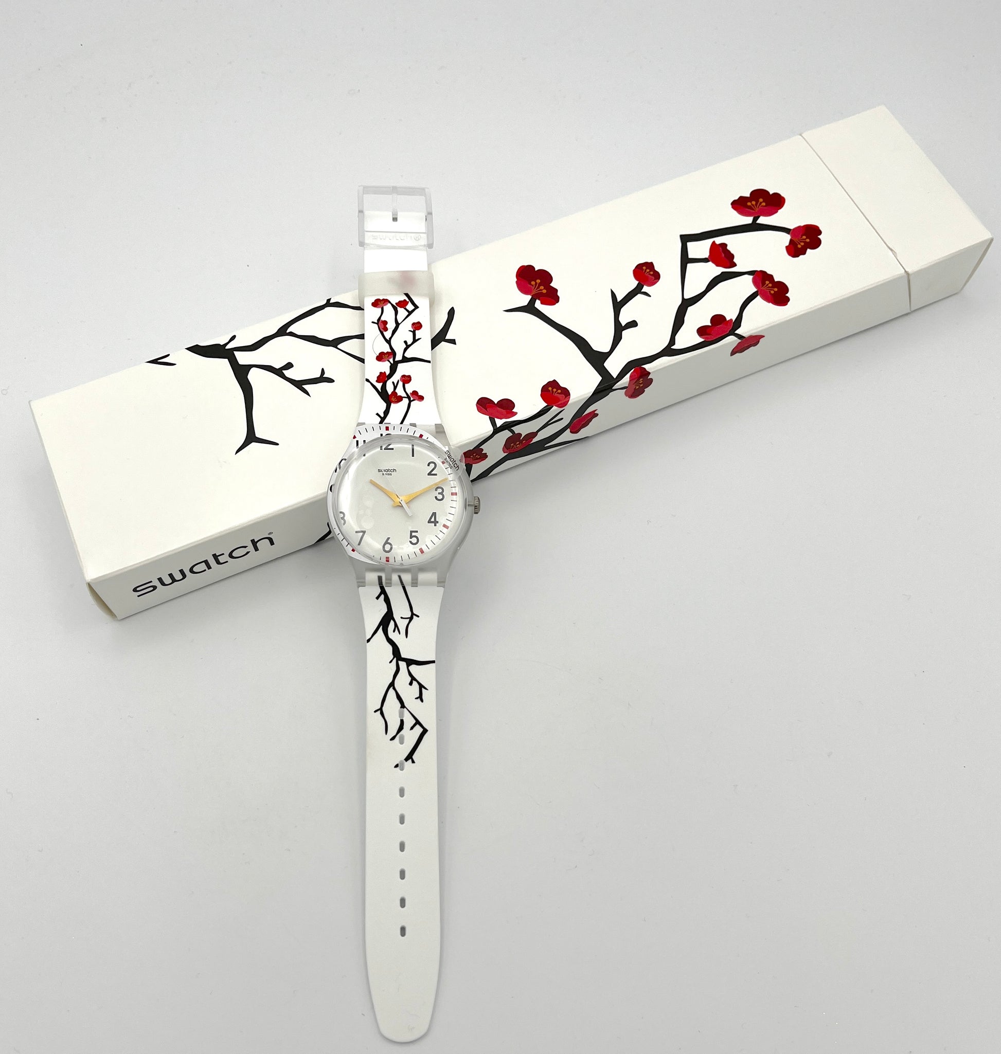 Floral DesignRed cherry blossoms on black branches are visible on the cardboard slipcase and white silicone strap. The white dial appears to have slipped slightly and is partially printed on the transparent plastic case. Golden hands point to the black numbers and bar indices.