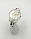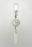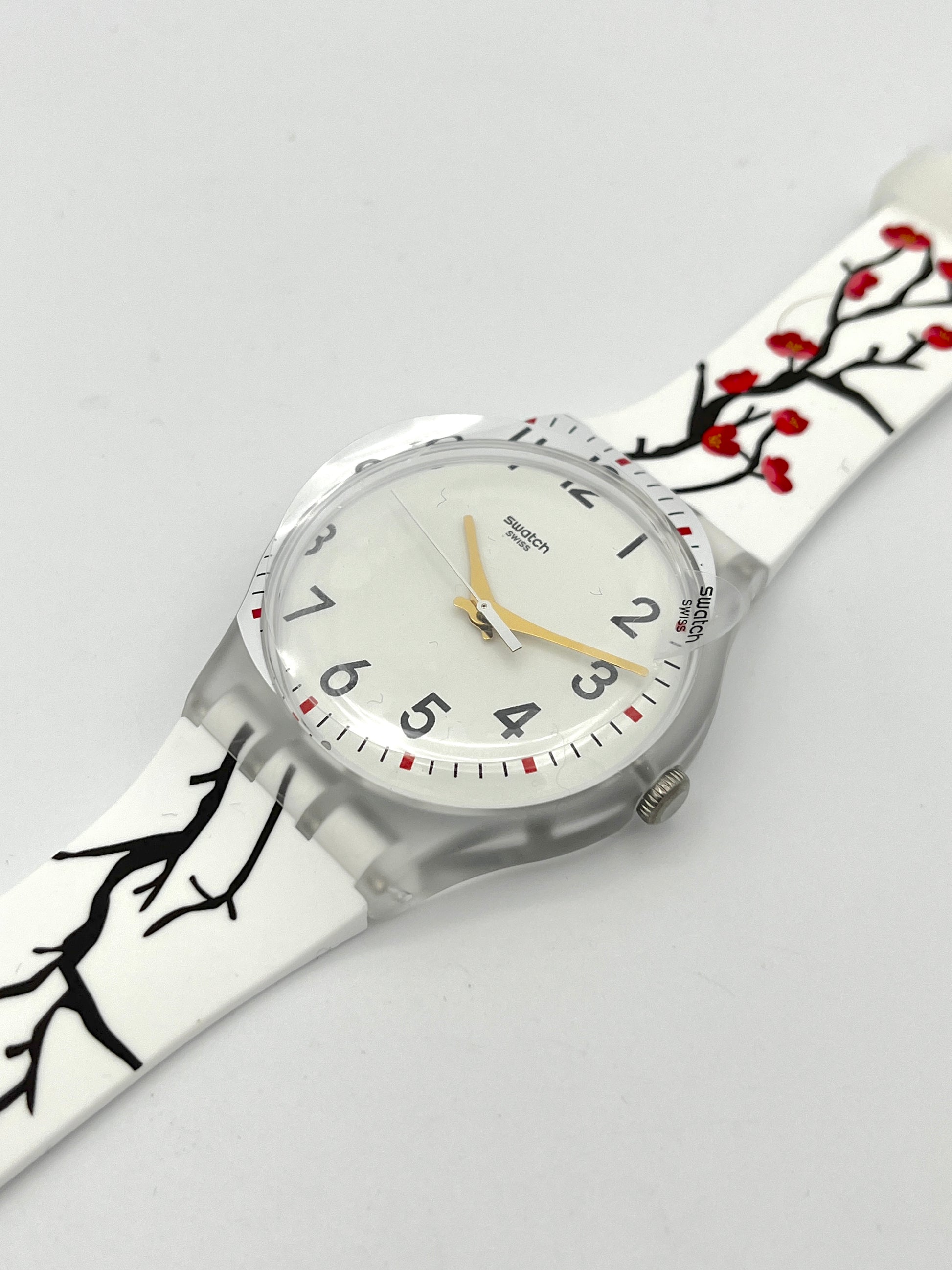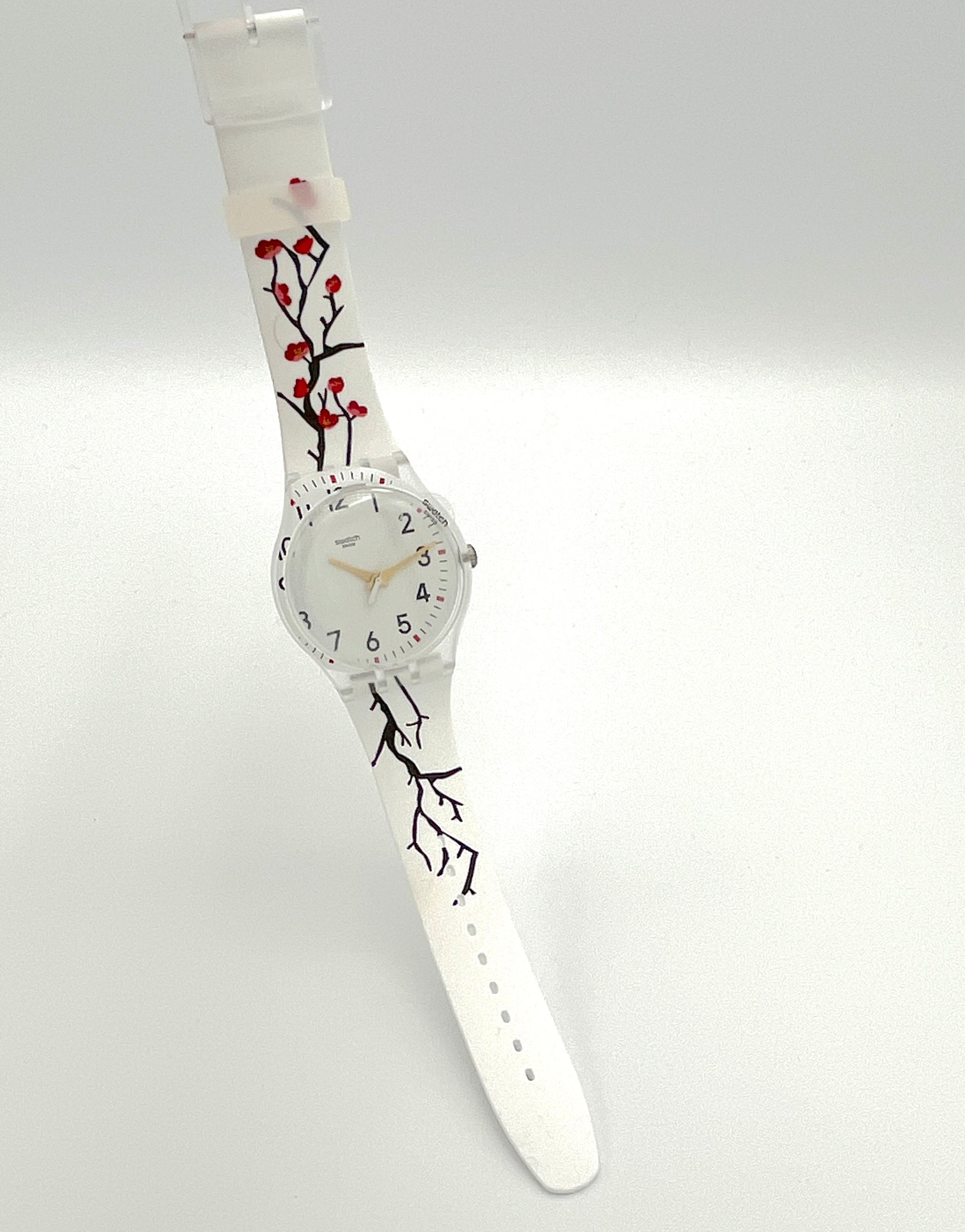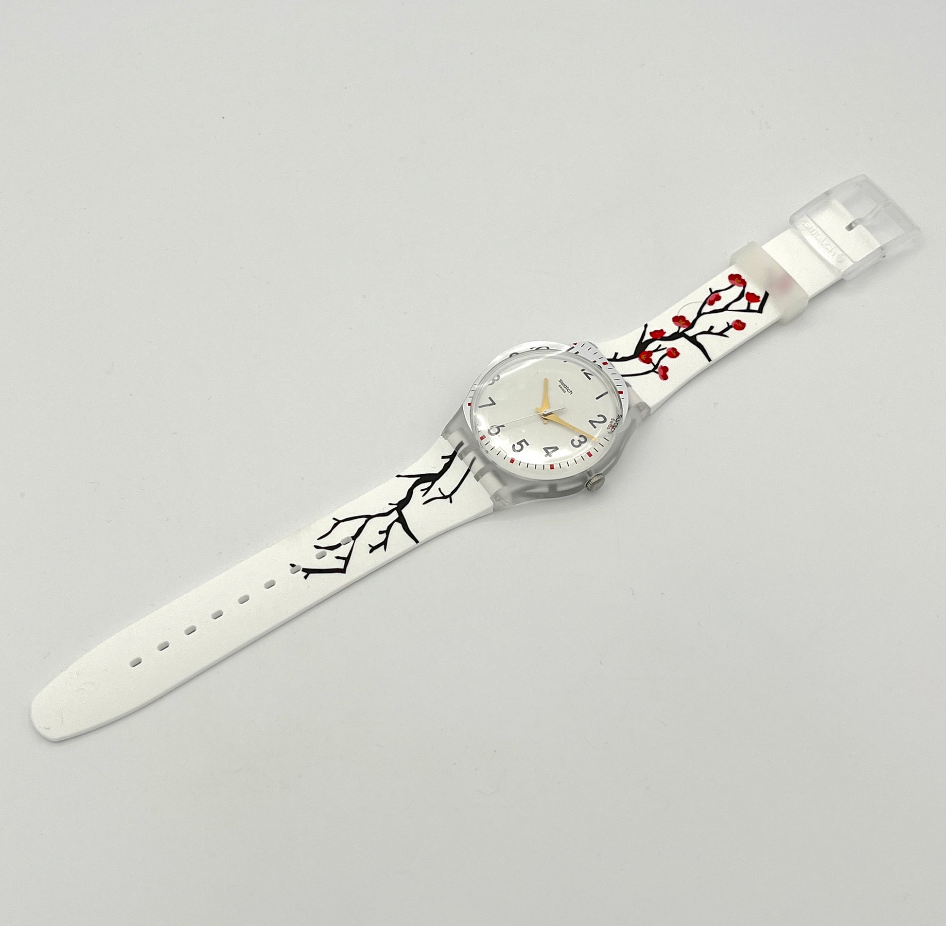 Floral DesignRed cherry blossoms on black branches are visible on the cardboard slipcase and white silicone strap. The white dial appears to have slipped slightly and is partially printed on the transparent plastic case. Golden hands point to the black numbers and bar indices.