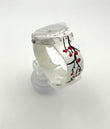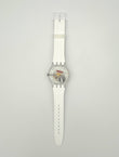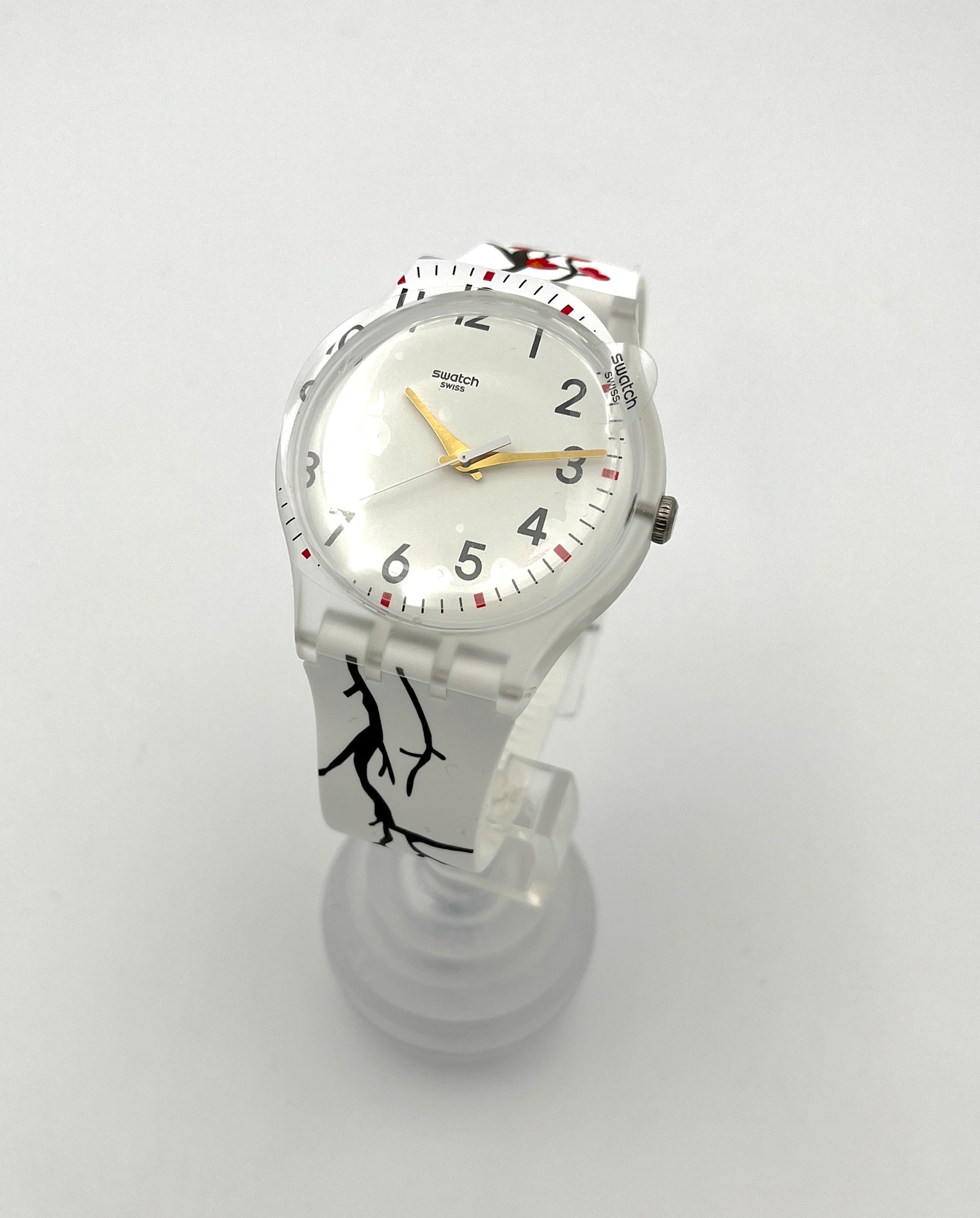 Swatch watch with a unique strap design on a white background