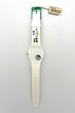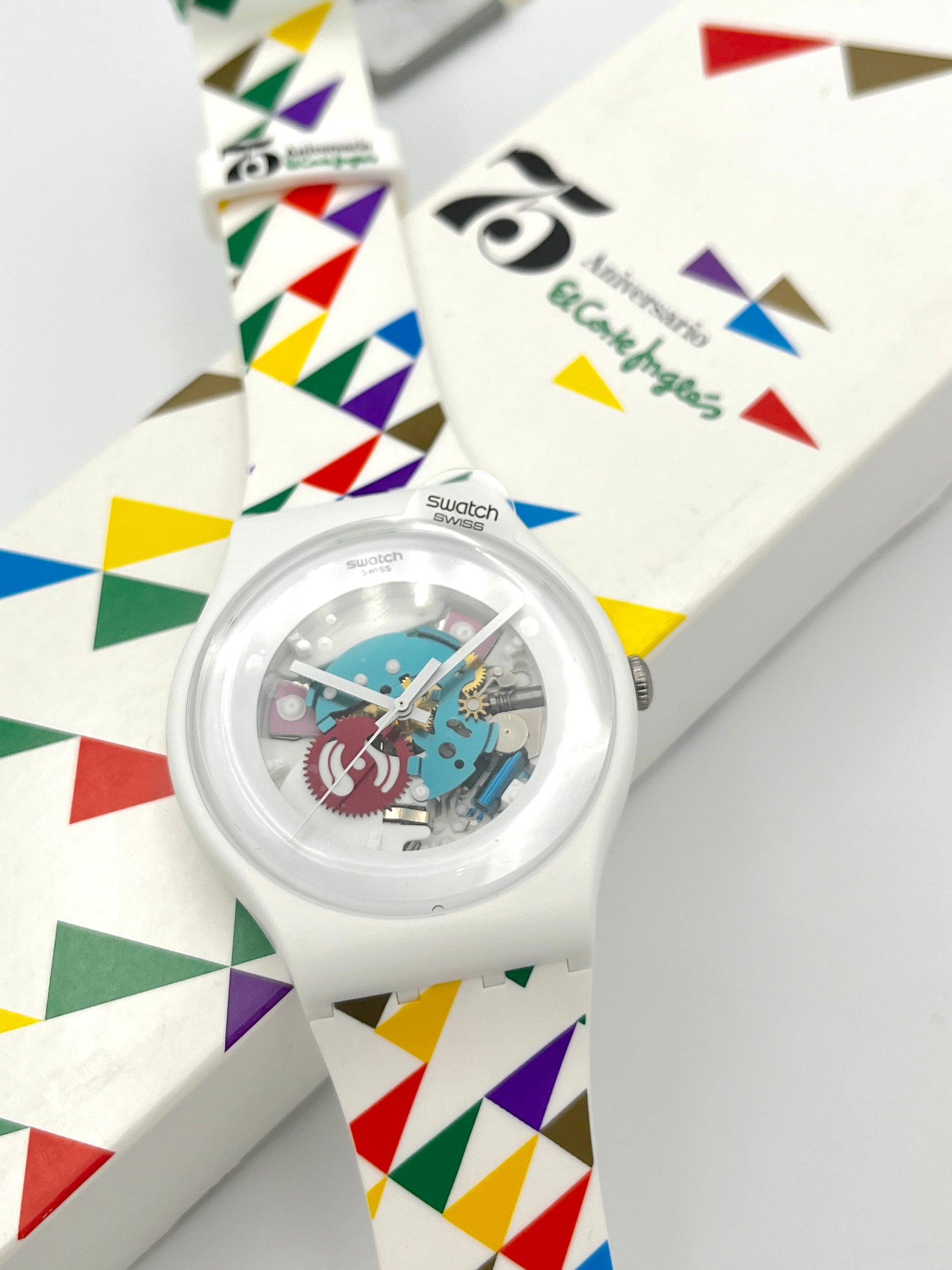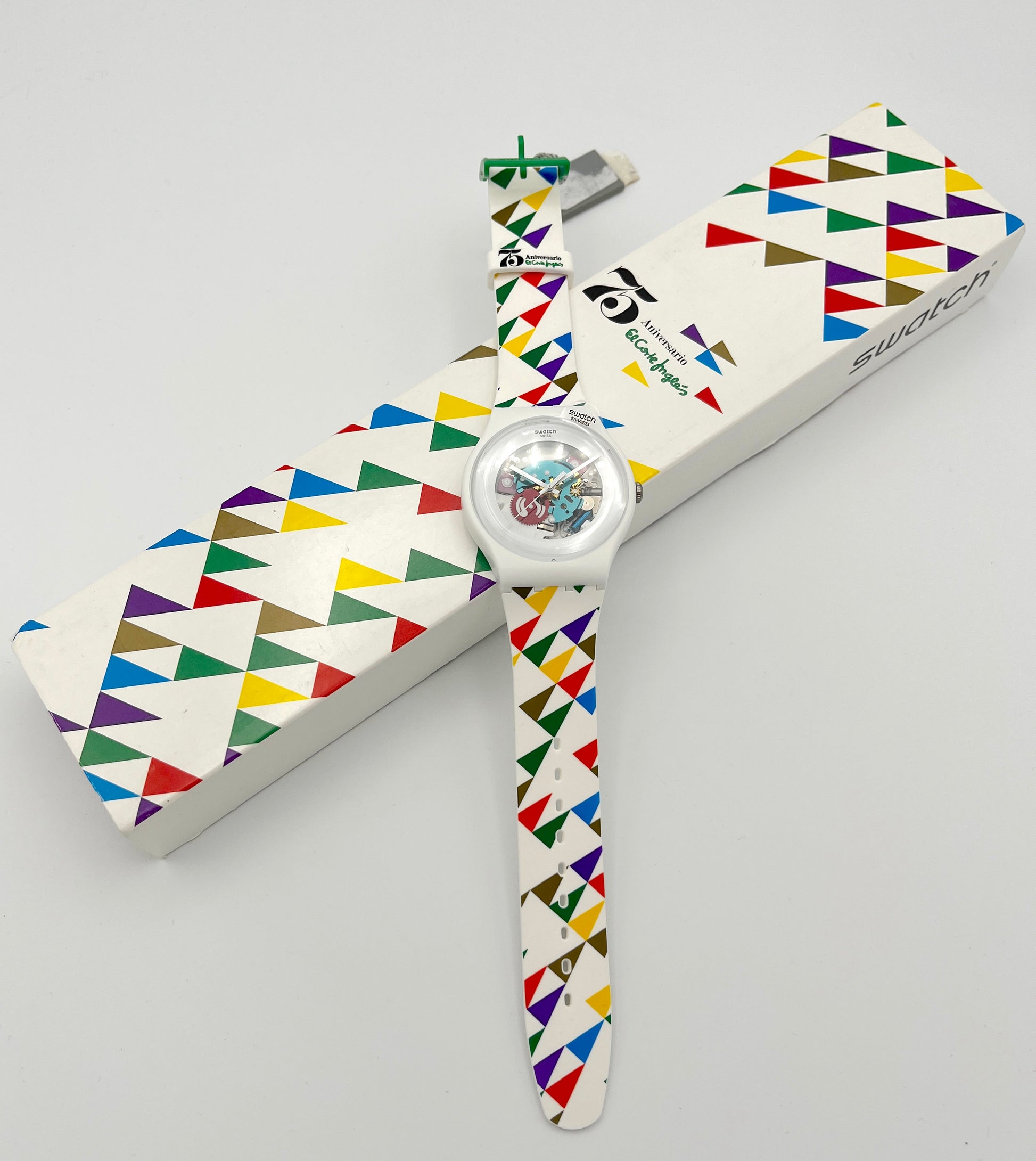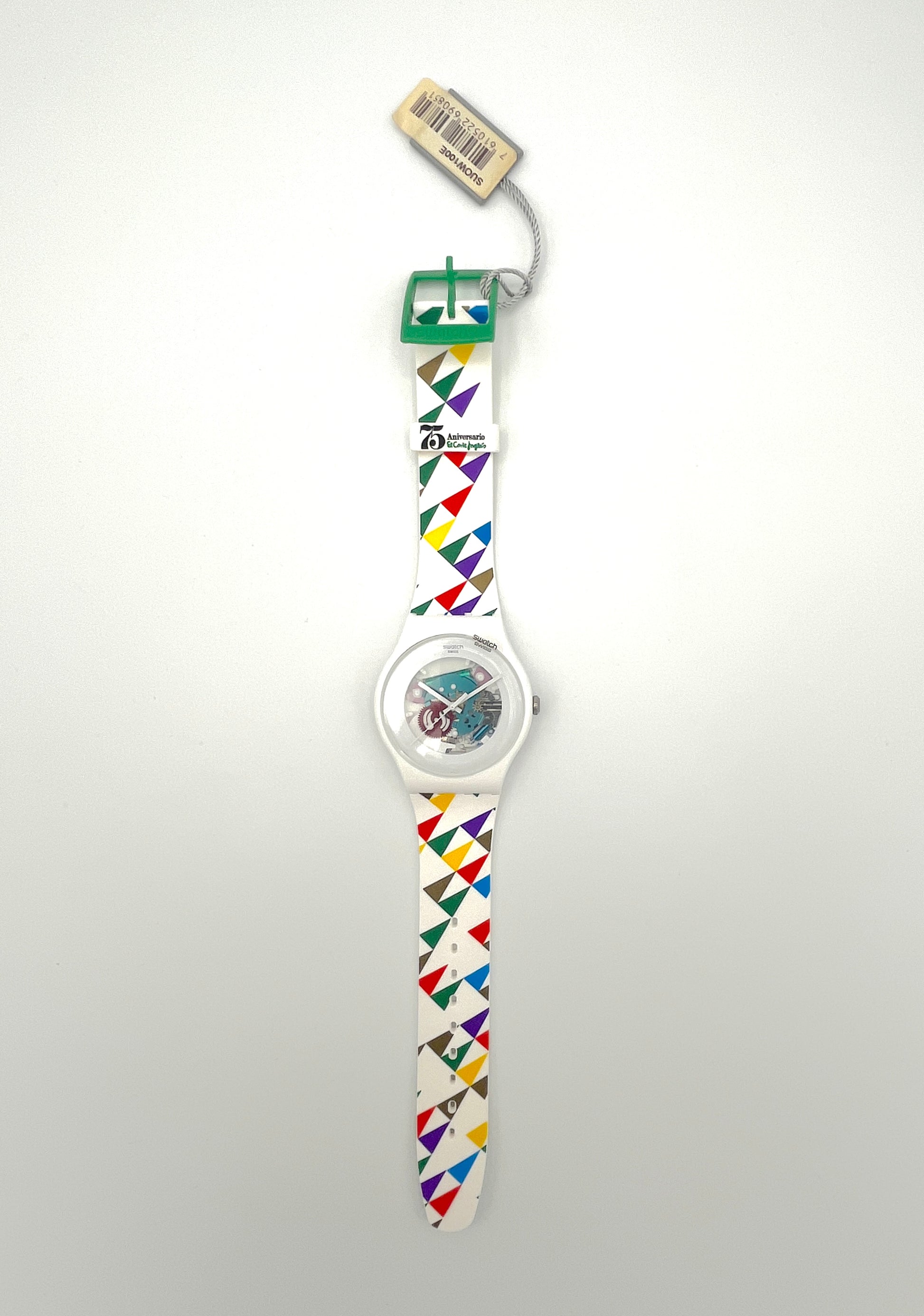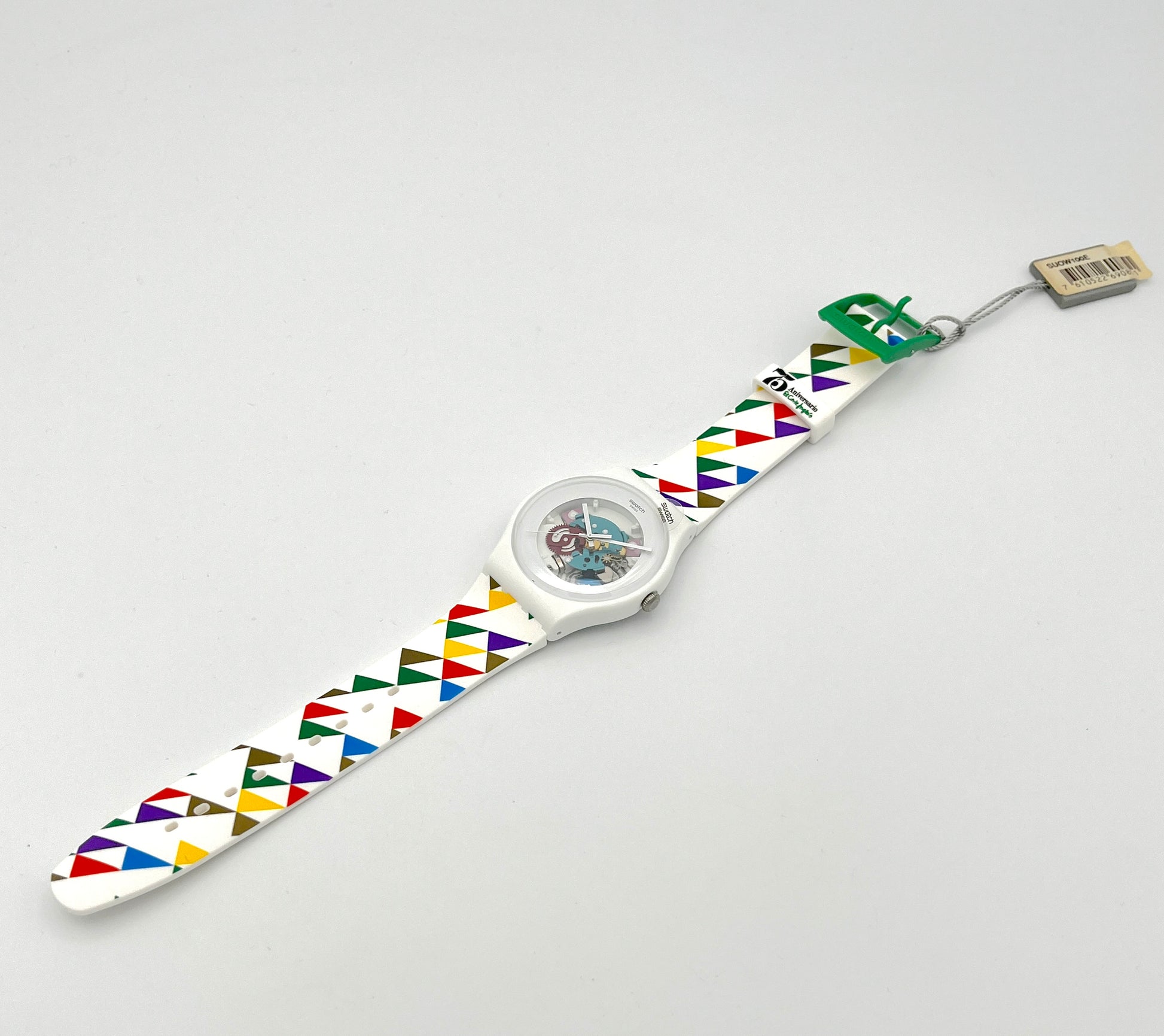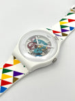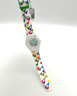 Swatch watch with a colorful geometric pattern on the strap against a white background