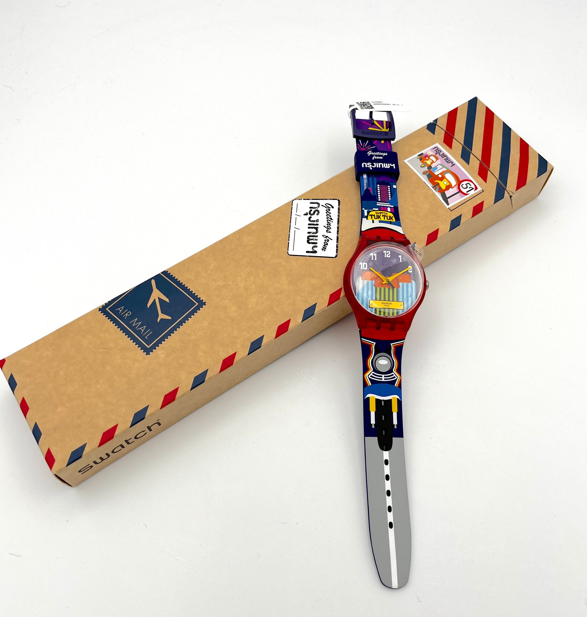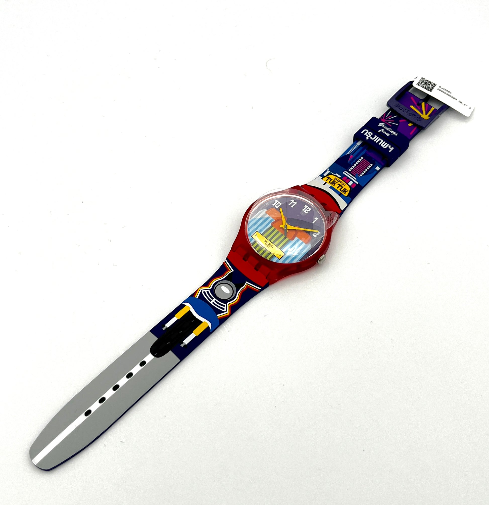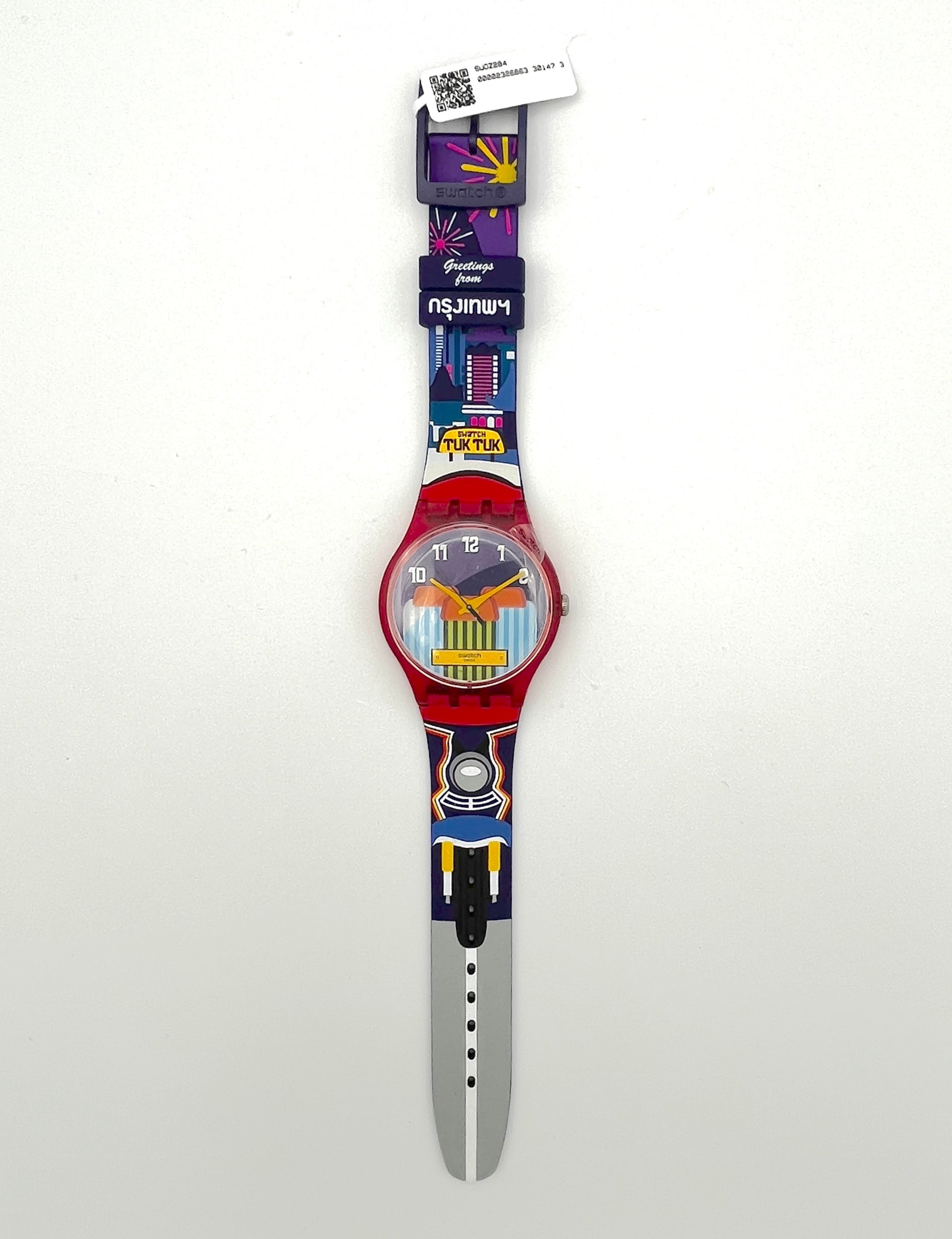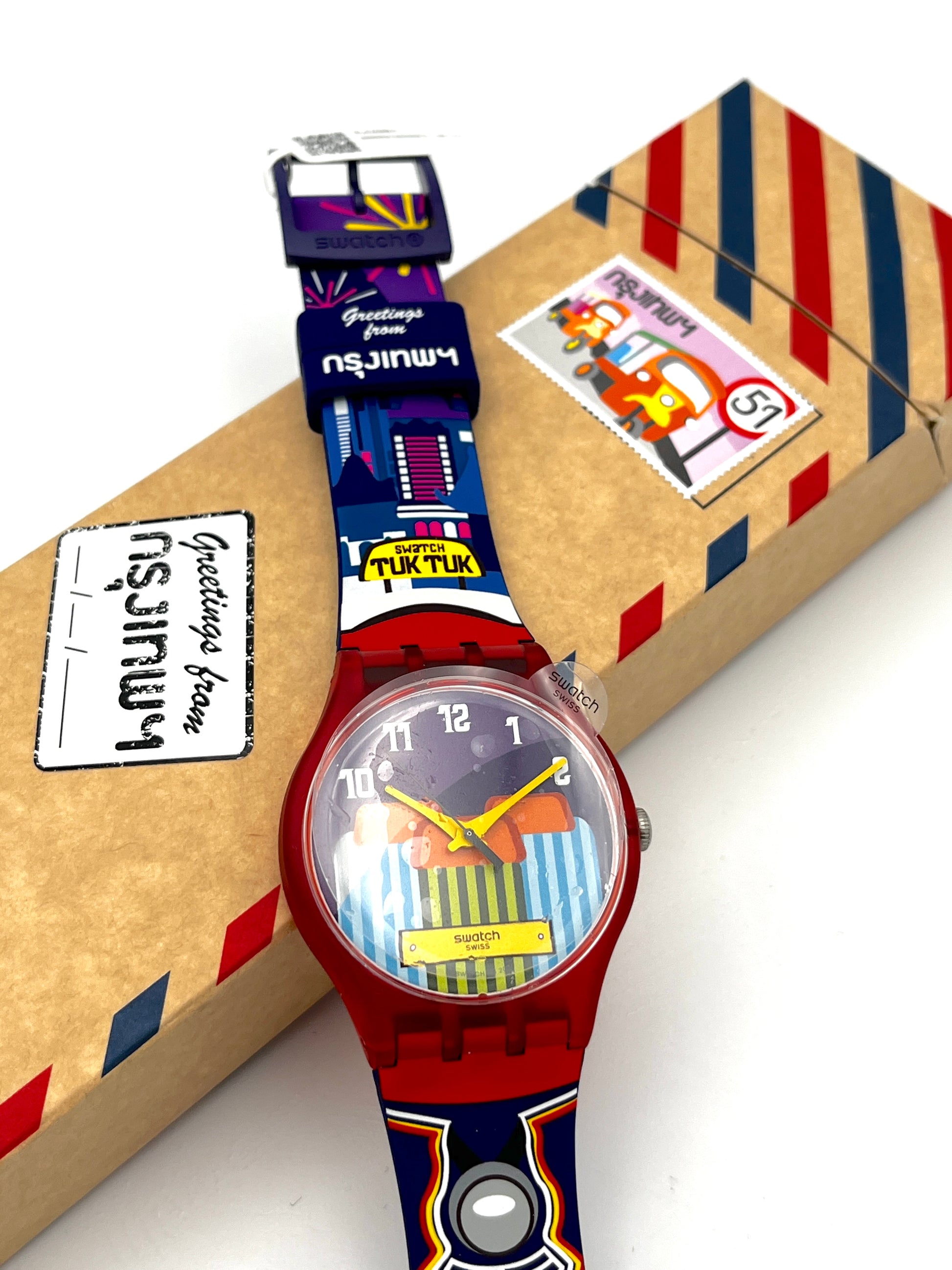 Exclusive Bangkok Special – Since 2016, Swatch has been creating Destination Specials, unique watches featuring charming details of cities and places around the world. One of these watches is the New Gent Special TUK TUK SAM-LOR, which, as the name suggests, is dedicated to the popular vehicle. It was sold exclusively at Bangkok Airport. Part of the rickshaw and the street are printed on the lower half of the silicone strap, while the upper half features the Bangkok skyline. The plastic case is red and the buckle is made of purple plastic to match the strap. The words “Greetings from Bangkok” can be read on both loops.