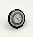 Black and silver clock with a white face on a white background