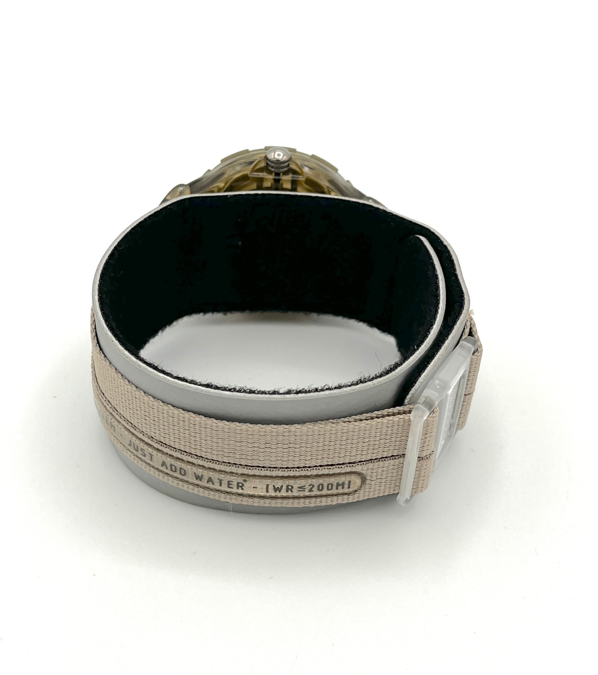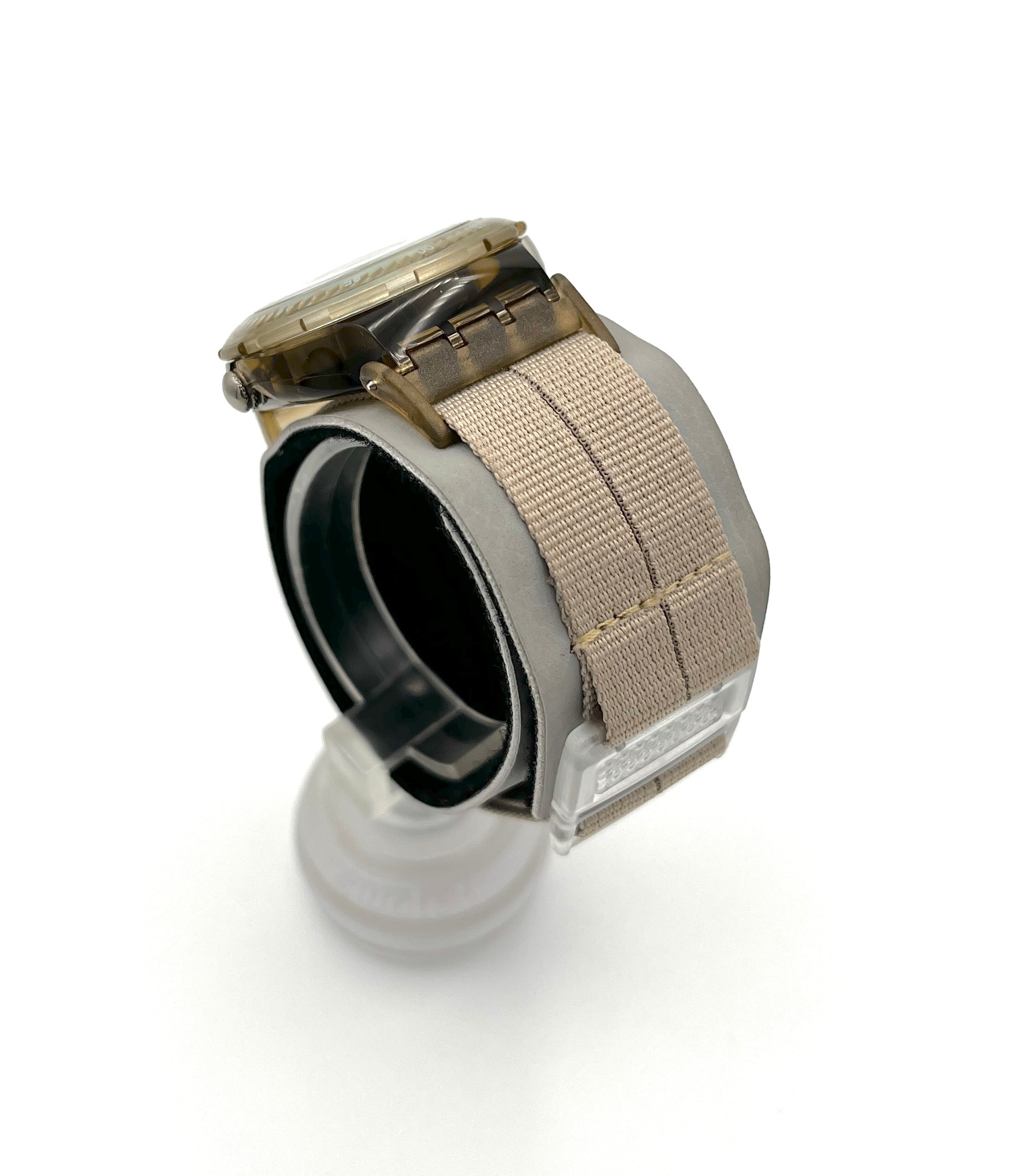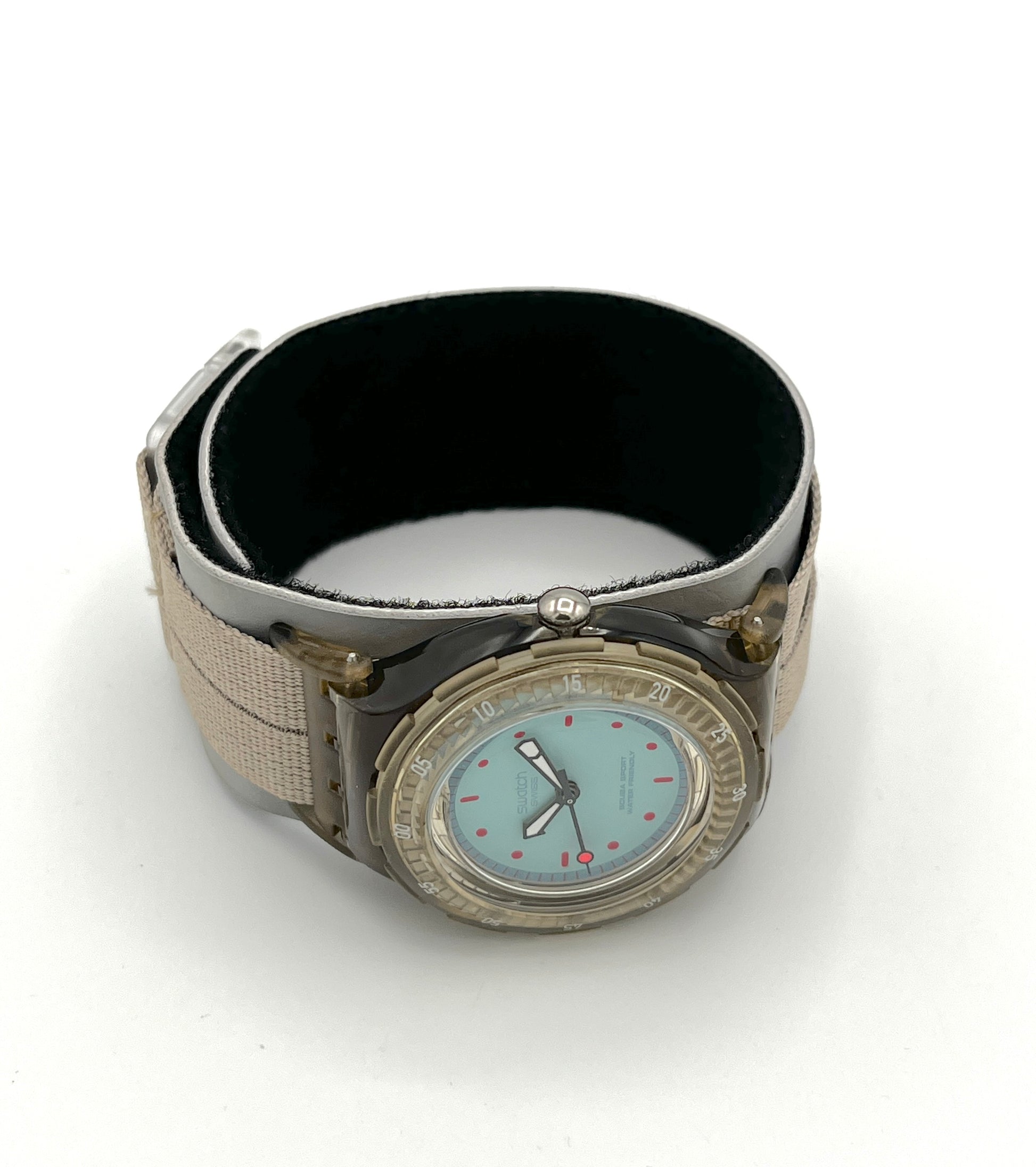 Double Strap Design – The rare Swatch Scuba 200 DOUBLEGANG comes from the Swatch diving watch series, which has been on sale since the 1990s. The watch has a rotating bezel, is waterproof, and has an accurate quartz movement with battery, as well as a soft textile strap that can be easily adjusted in length. This classic model dates back to 2001.
