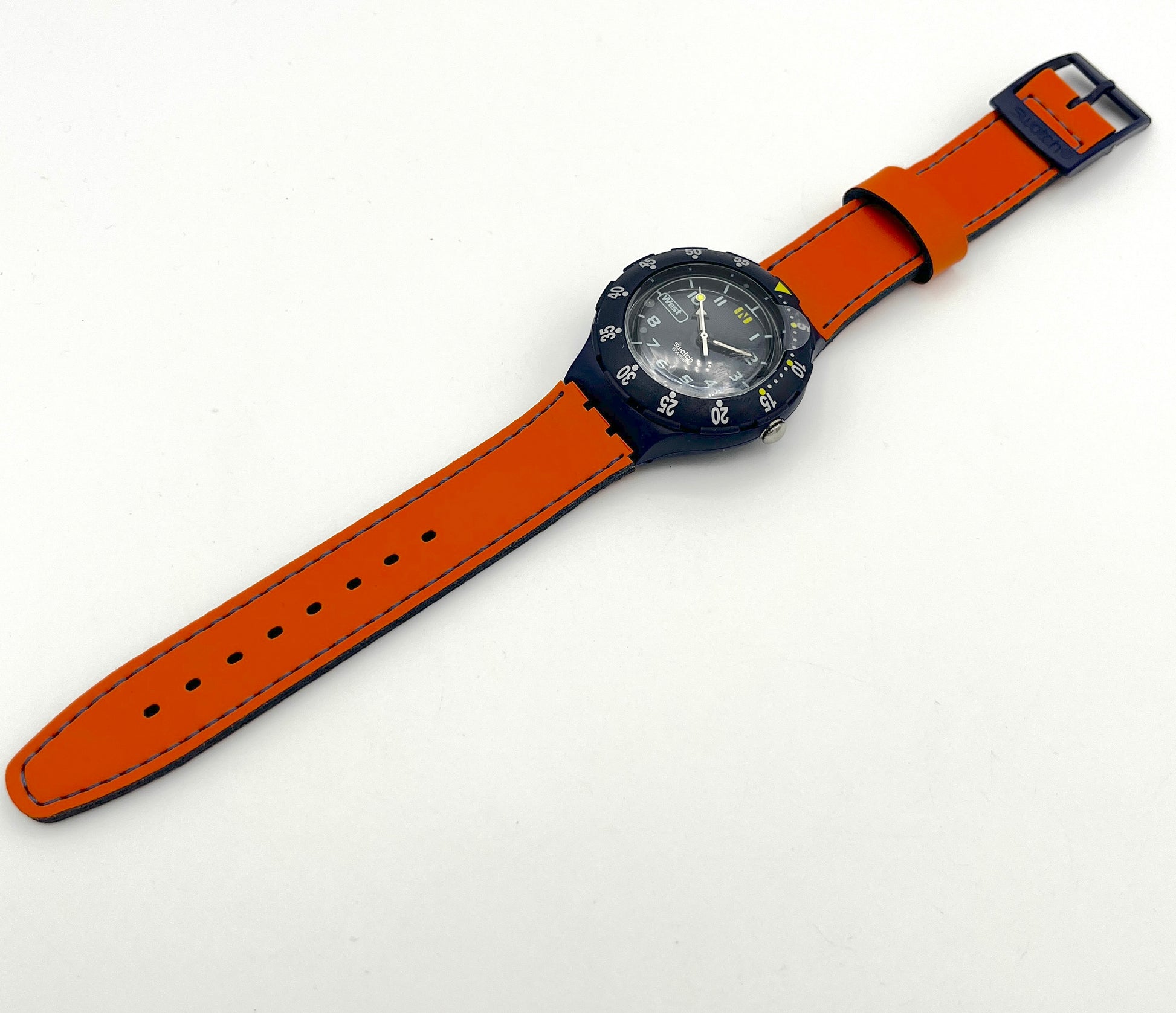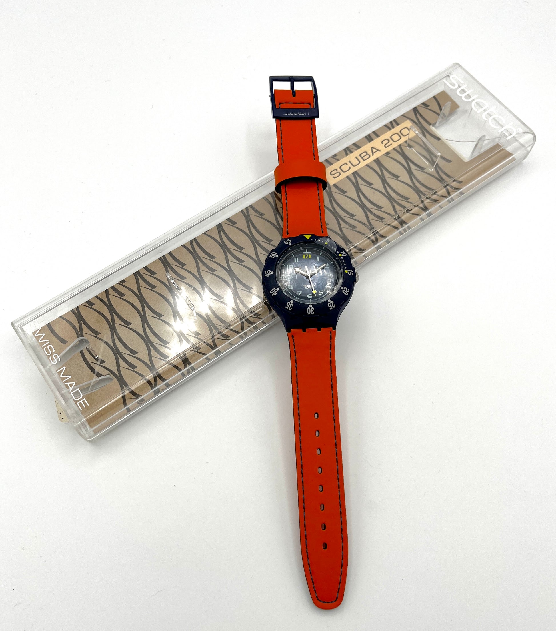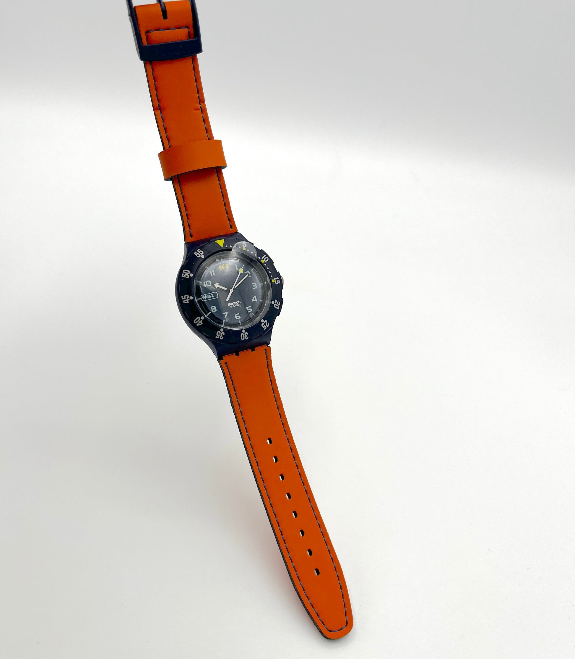 Maritime Design – The extremely rare Swatch Scuba 200 HYDROCOMPASS comes from the late 90s' Swatch Scuba200 series. The watch has a rotating bezel, is water-resistant, and has an accurate quartz movement with battery. The extra-soft plastic strap is orange on both the top and bottom.