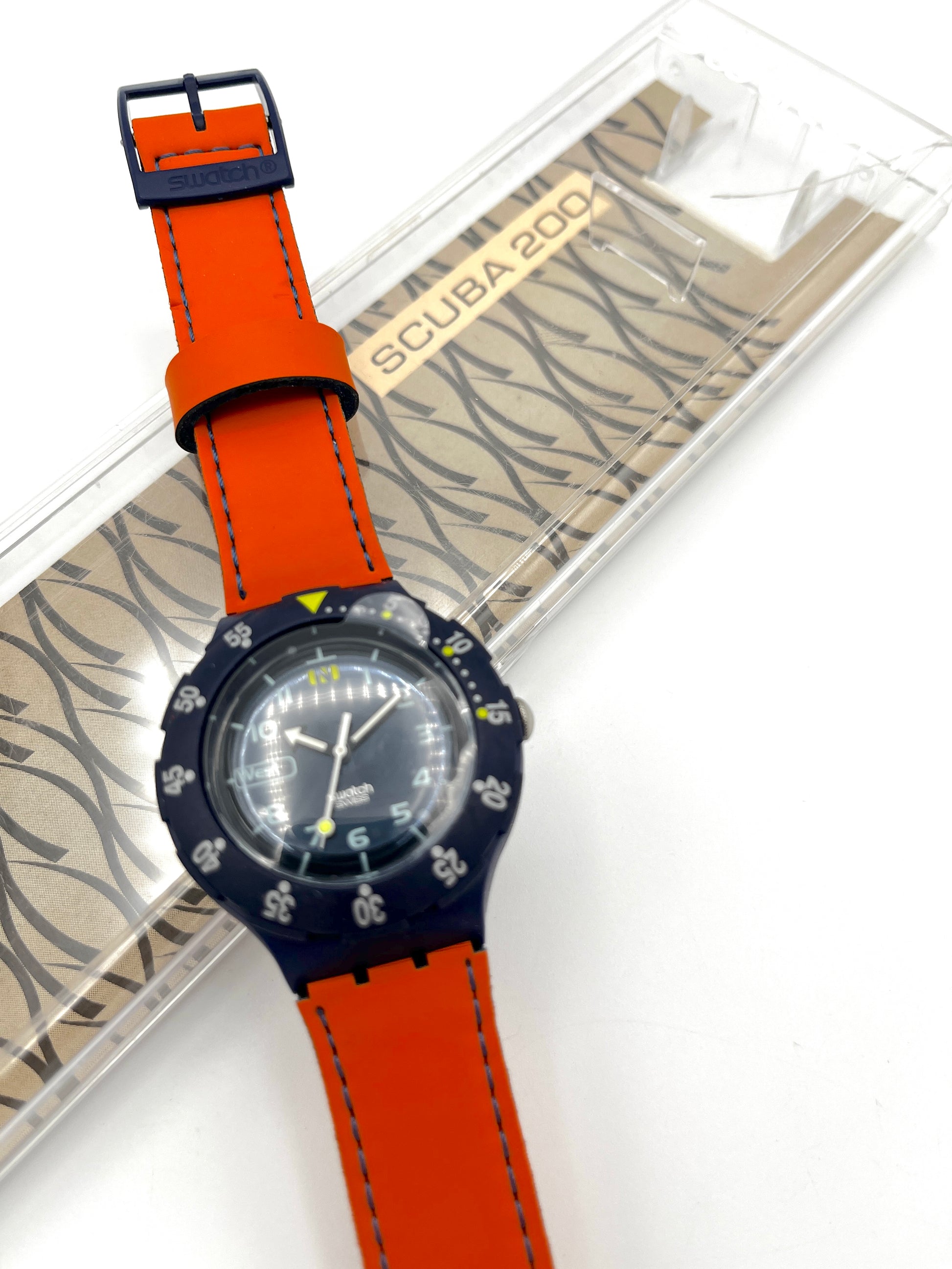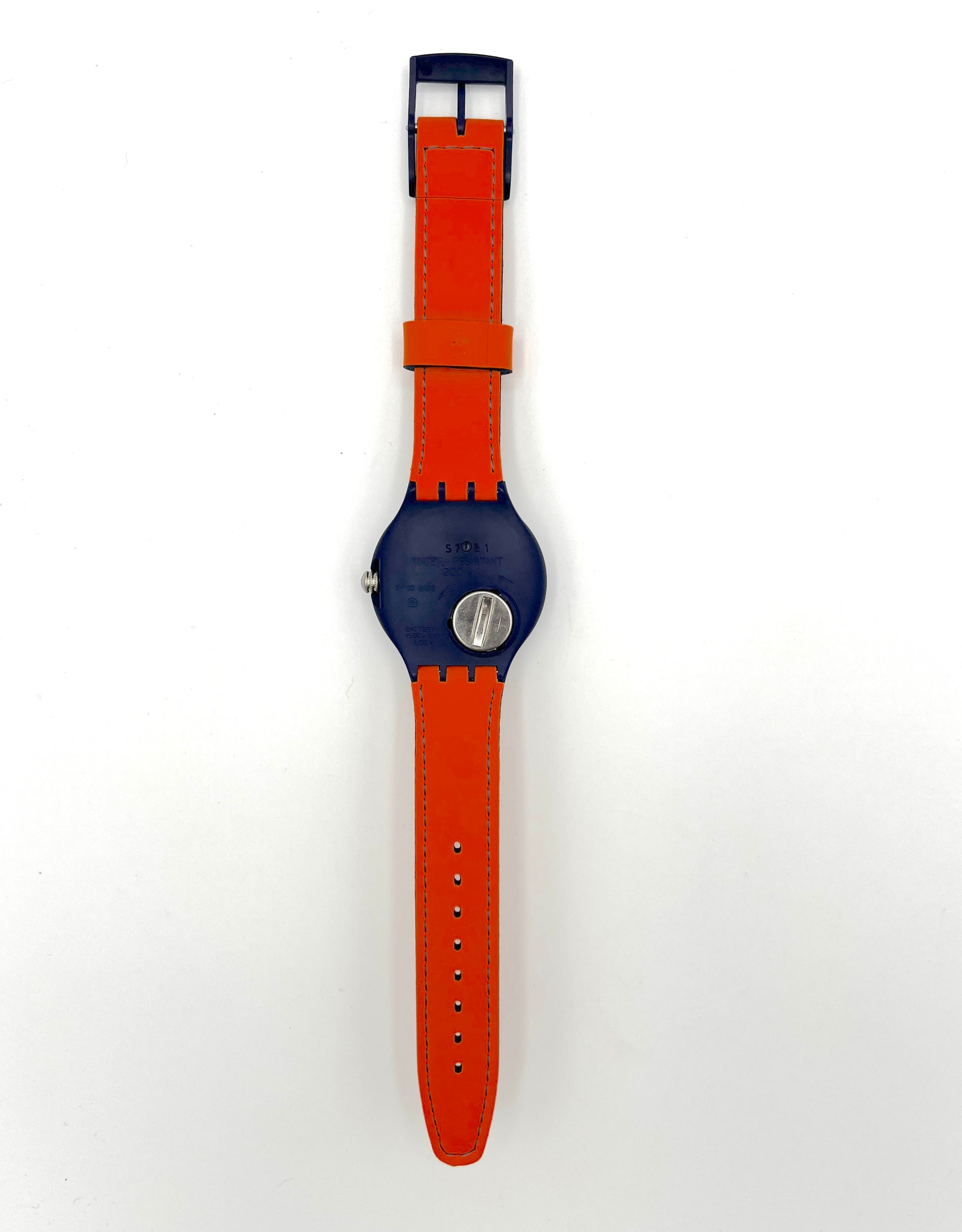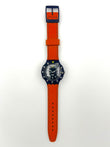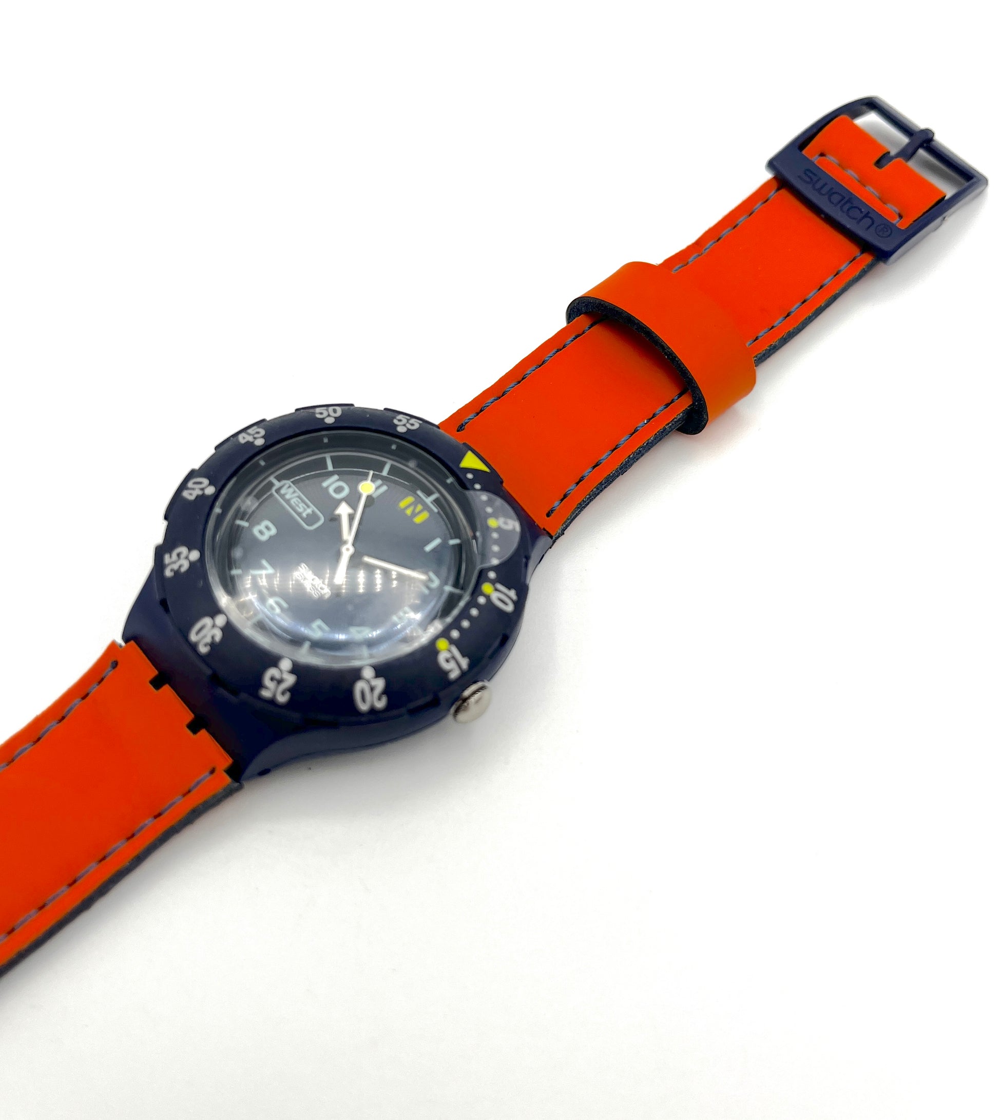 Maritime Design – The extremely rare Swatch Scuba 200 HYDROCOMPASS comes from the late 90s' Swatch Scuba200 series. The watch has a rotating bezel, is water-resistant, and has an accurate quartz movement with battery. The extra-soft plastic strap is orange on both the top and bottom.