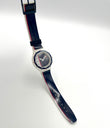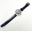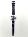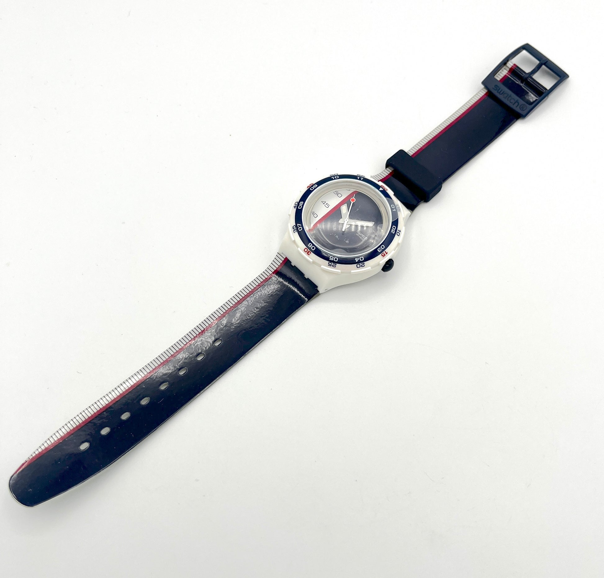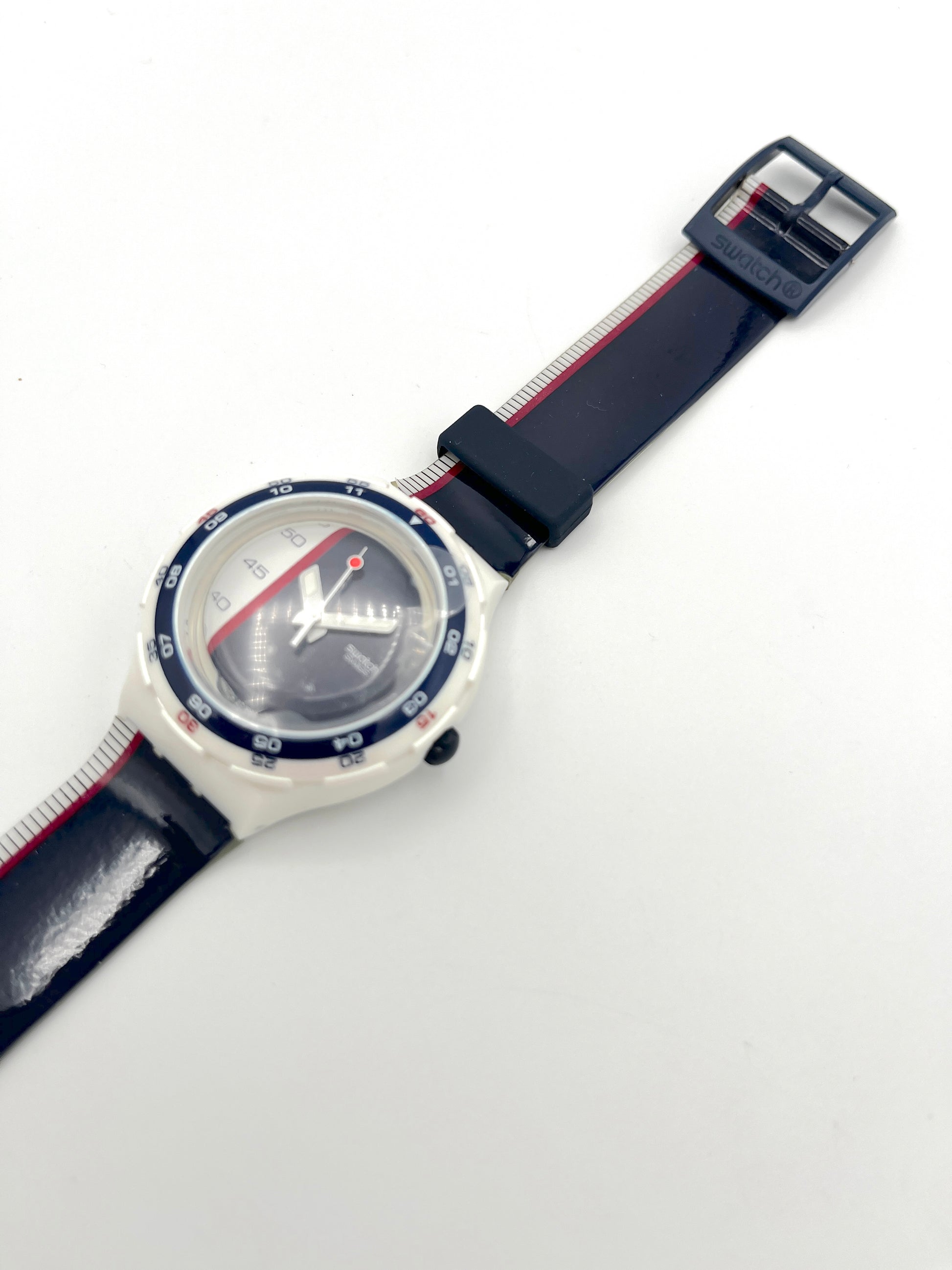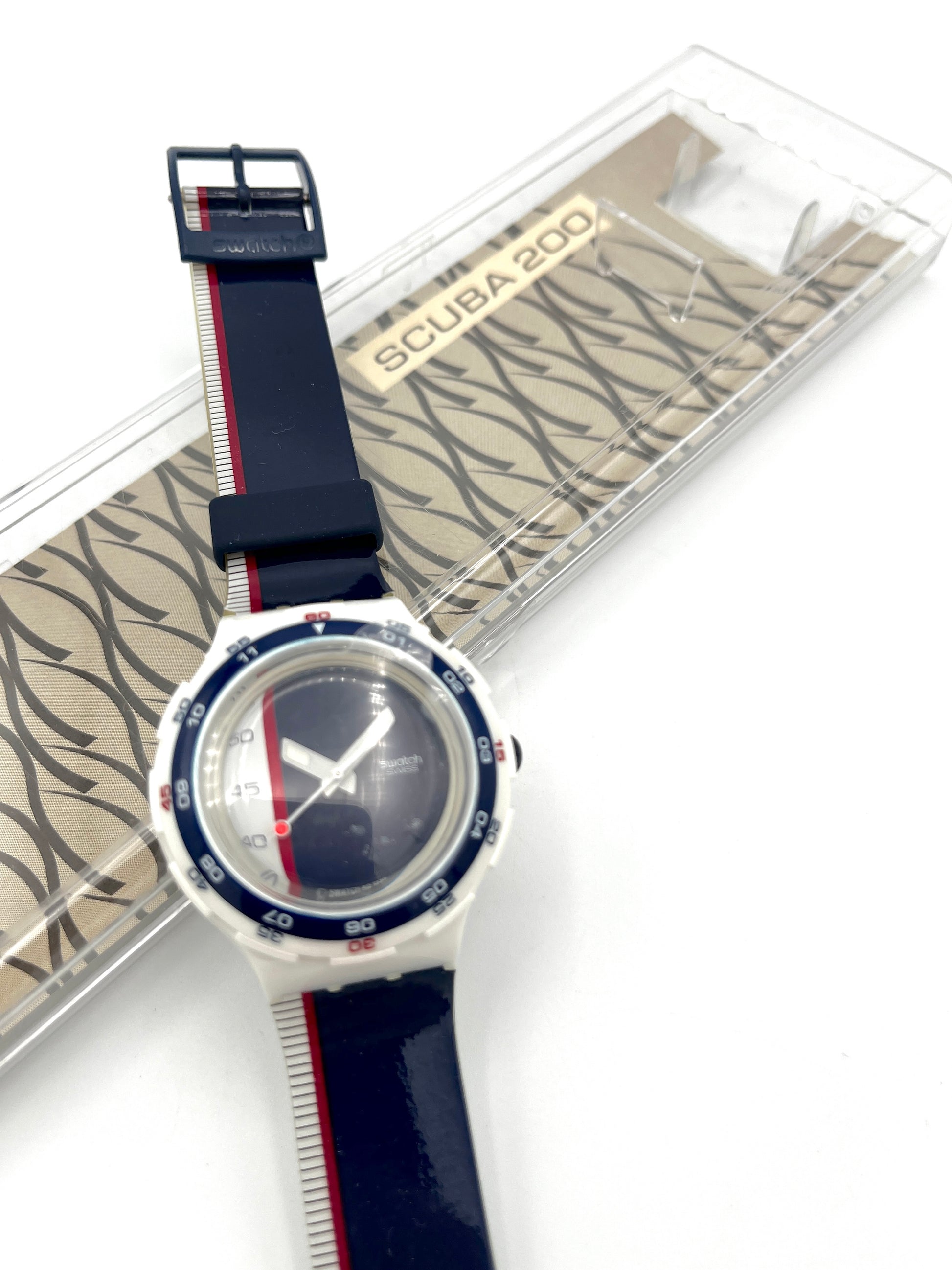 Maritime Design – The 1998 maritime Swatch Scuba 200 SAILOR comes from one of the first series of Swatch diving watches. The watch is colored in typical sailor style dark blue with red and white. A delicate white line with filigree stripes adorns the entire watch. The dial is also dark blue with red and white lines and white hands.