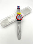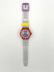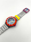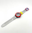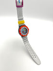 Colorful watch with a red bezel, yellow strap, and silver band on a white background