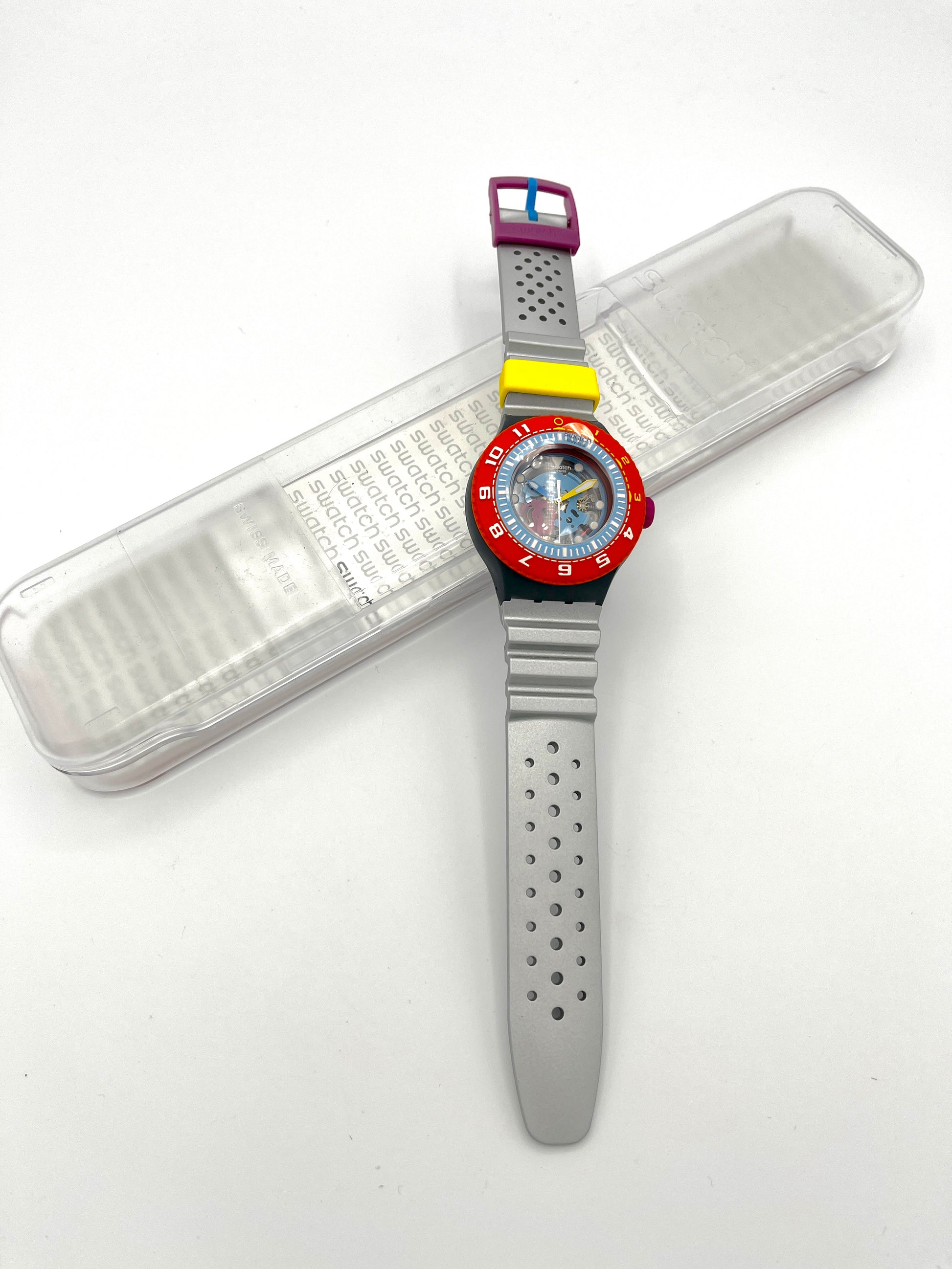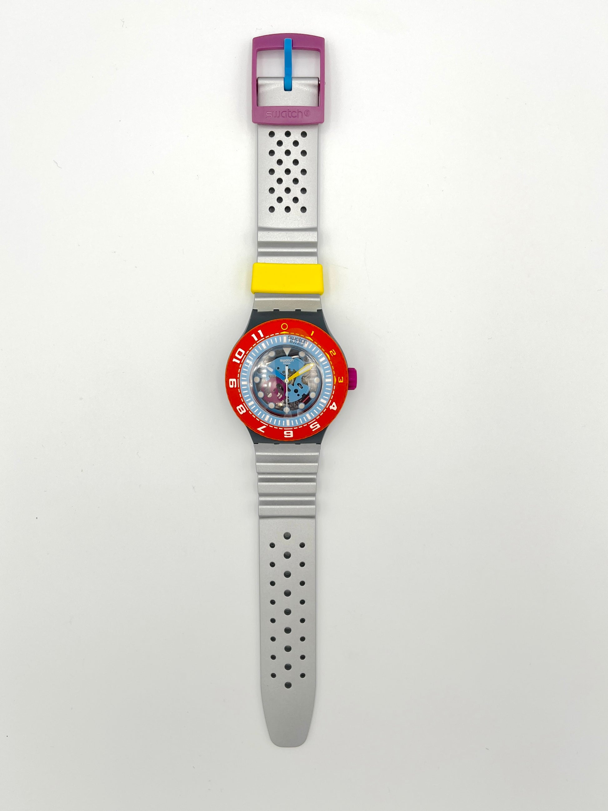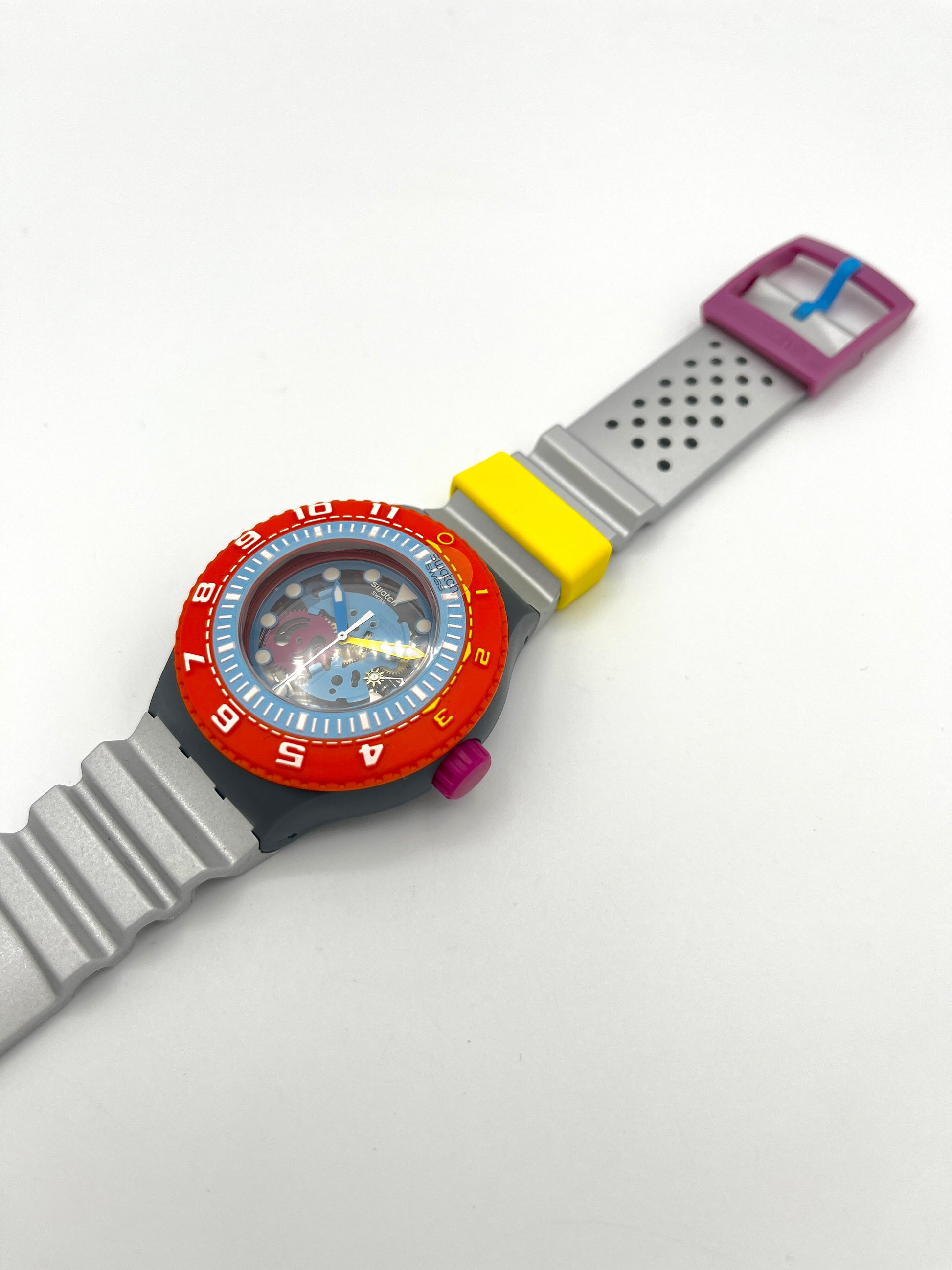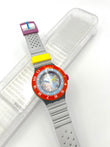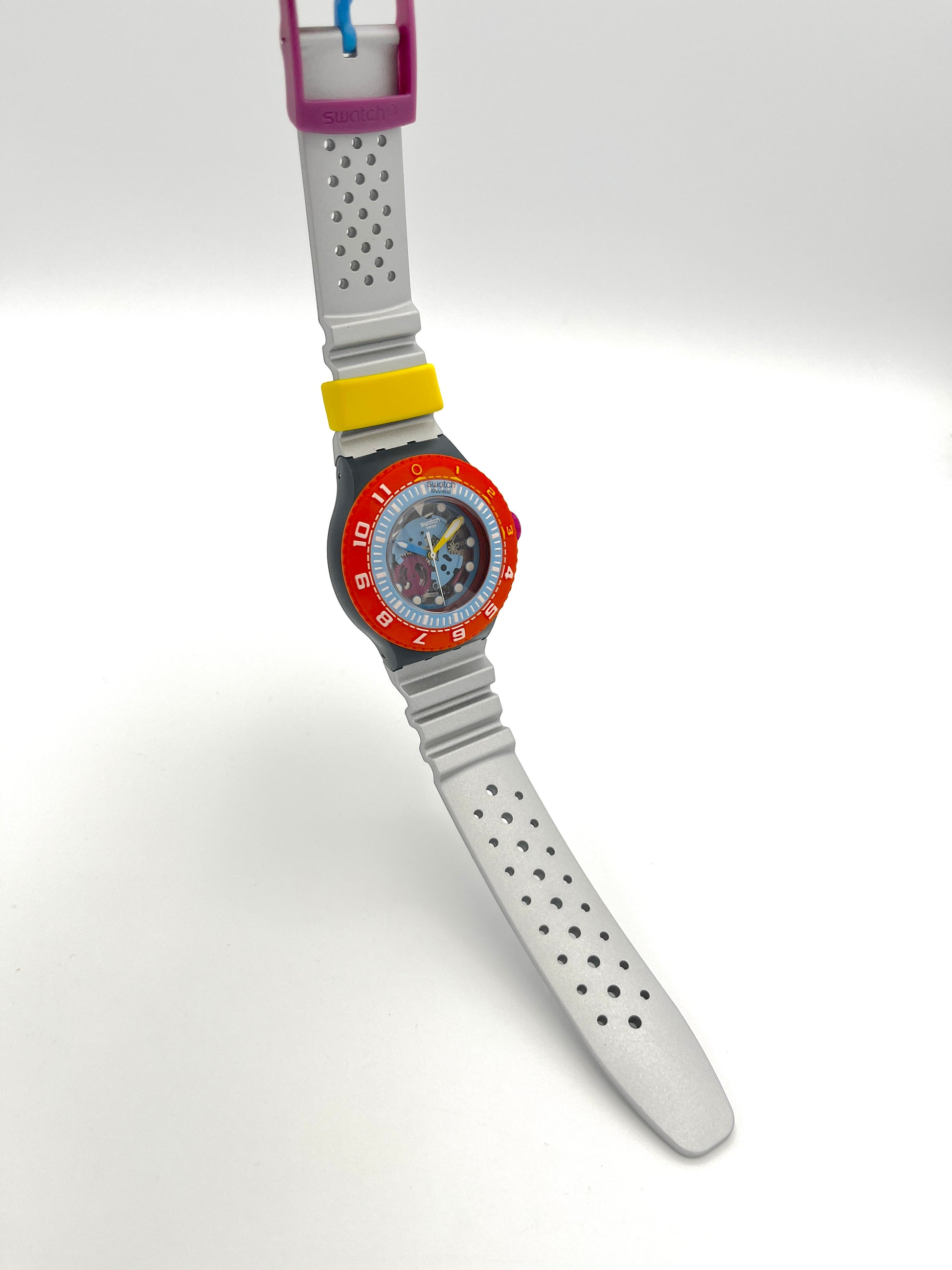 Bright Orange Bezel – The most striking feature of the Swatch Scuba Libre SEA THROUGH is undoubtedly its bright orange bezel. The skeletonized dial offers a glimpse of the model's colorful movement, and the soft, silver-gray silicone strap fits perfectly on the wrist.